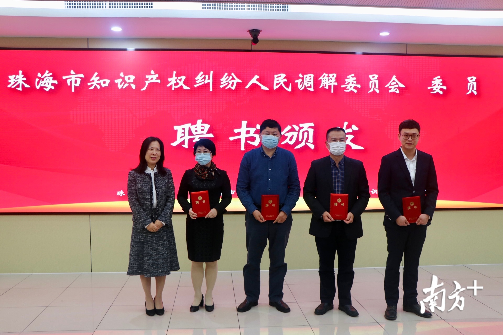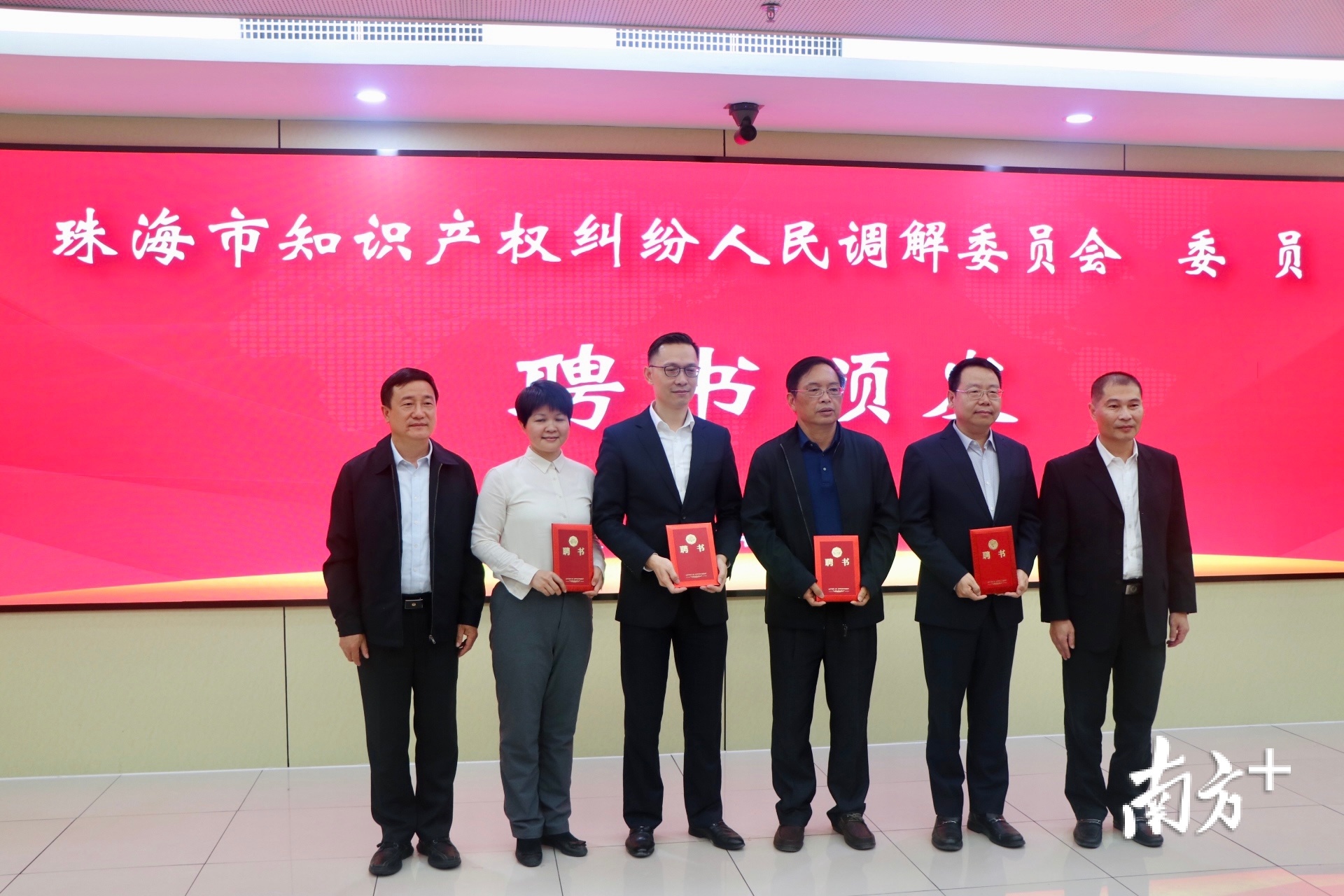 相关领导为珠海市知识产权纠纷人民调解委员会委员、调解员代表颁发聘书。