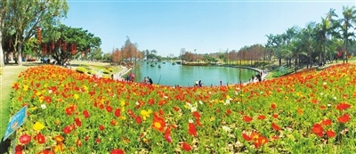 周日的海滨公园百花竞放,游客如织。海滨公园管理处副主任刘华敏告诉记者,2021年新春花展主会场选址海滨公园,展出花卉30万株,全园主题为“春禧”,园内十大立体景点分布在东门大草地片区、正门广场片区和北门环湖片区三个区域内。其中10万株最受喜爱的郁金香作为主景点花卉。