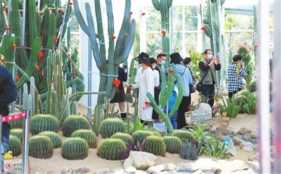 昨日上午10时,记者现场看到,市民们排队检测体温后,有序进入沙漠植物园内观赏沙漠植物。植物园入口处张灯结彩,园内外到处贴着年画、福字,沙漠植物上悬挂着数百个红彤彤的小灯笼,浓浓的中国年味扑面而来。