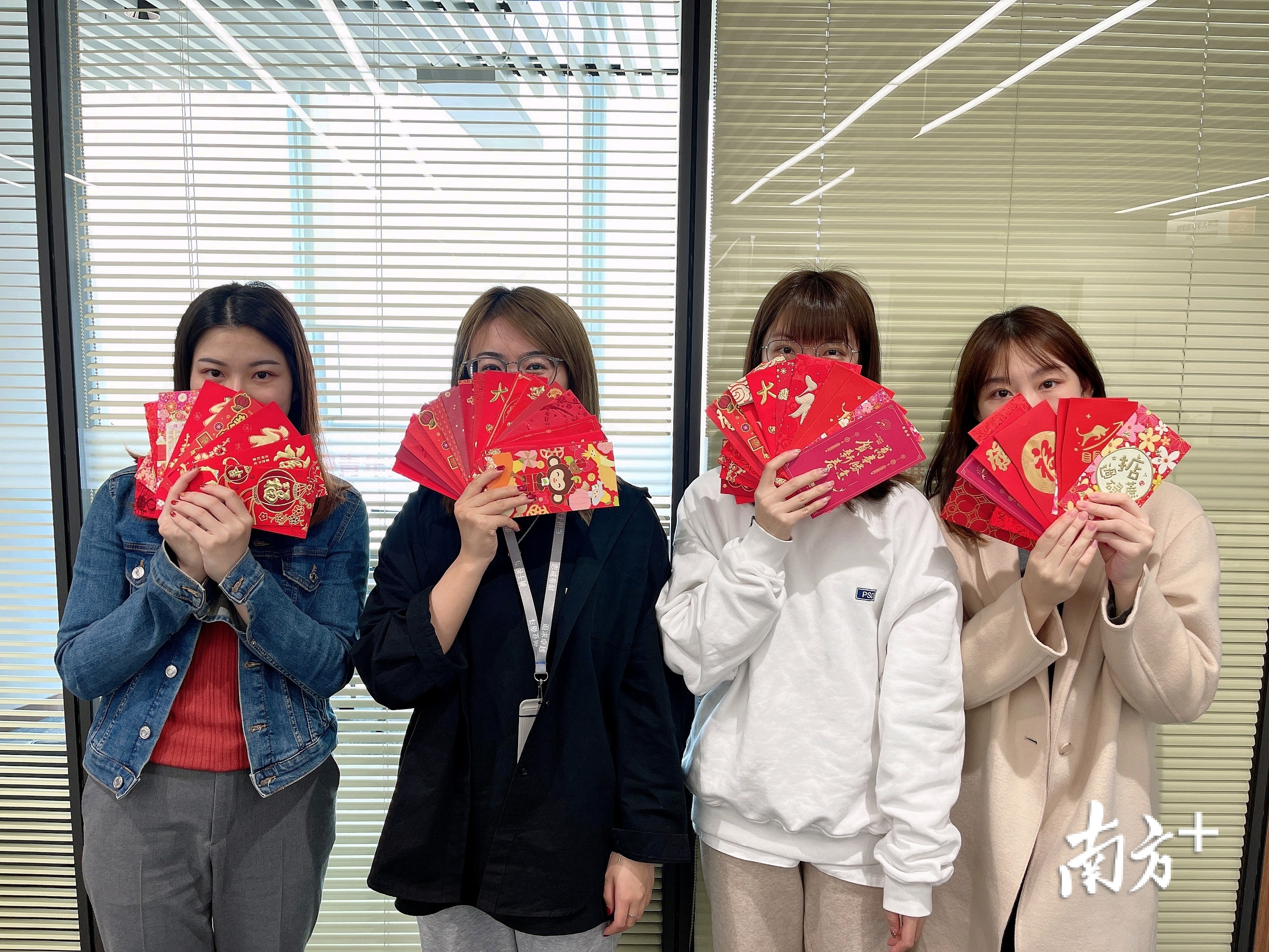 第一批回到公司的员工相互道以新年祝福并送上新年利是封。