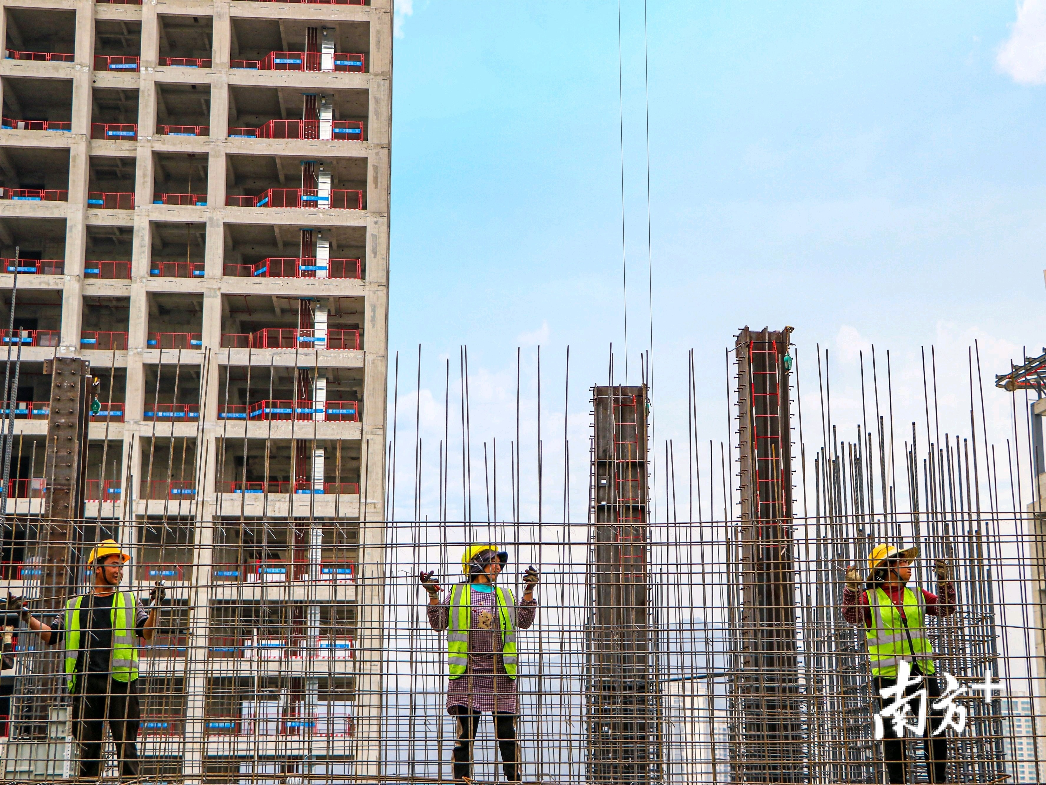 珠澳湾世纪中心项目,建筑工人们分工协作绑扎钢筋。
