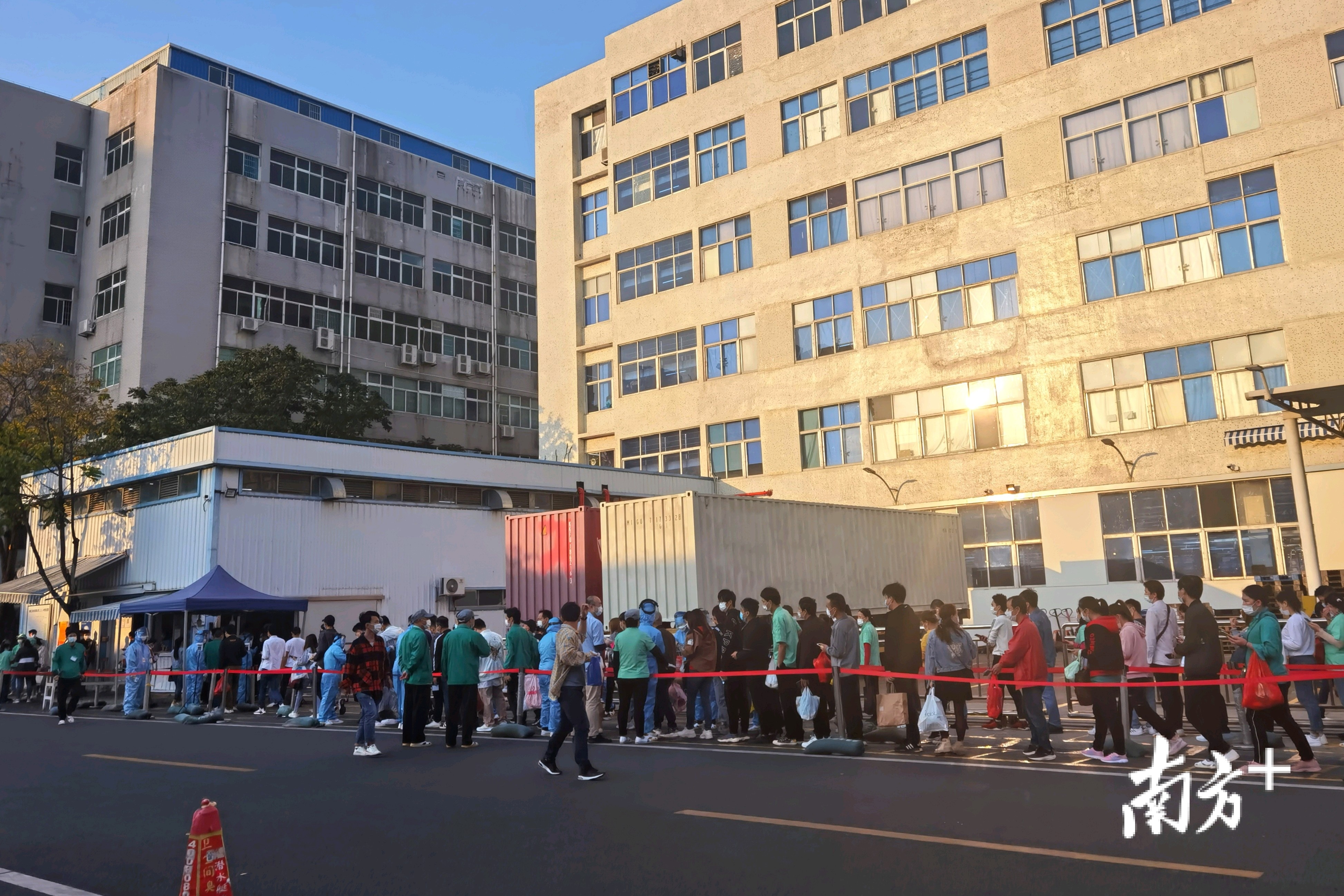 珠海三美电机公司员工有序地排队接受体温检测、健康码和行程码扫描。