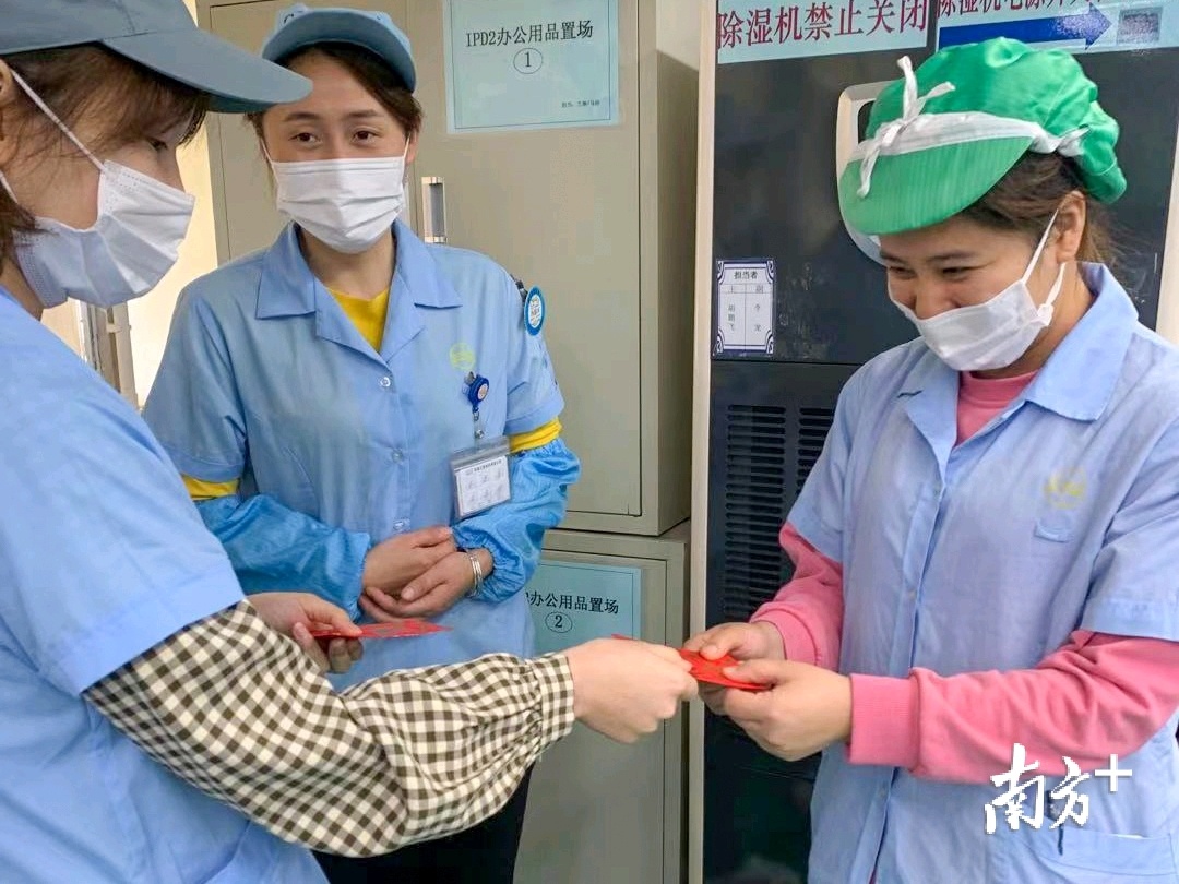 当日上午,珠海三美电机有限公司5000多名员工也早早回到公司有序地排队接受体温检测、健康码和行程码扫描。第一批回到公司的员工相互道以新年祝贺,并送上新年利是封,还有的员工采用手机支付的形式随机抽取红包。