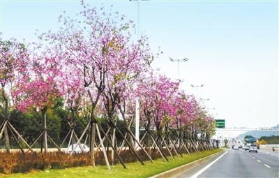 据悉,在我国第43个植树节到来之际,粤华园林公司契合珠海大道的道路景观设计理念,自3月1日起,在珠海大道南屏段(赛纳公司、均昌、双城汇花园、绿湖山庄等路段)的中间绿化带增加种植宫粉紫荆等开花乔木,单日种植量超过200株,道路全线开花乔木增加到2400多株,灿若霞云的粉嫩花朵点缀在生机勃勃的绿叶中,如娇羞的少女欲说还休,让整条主干道弥漫着轻柔浪漫的温馨气氛。