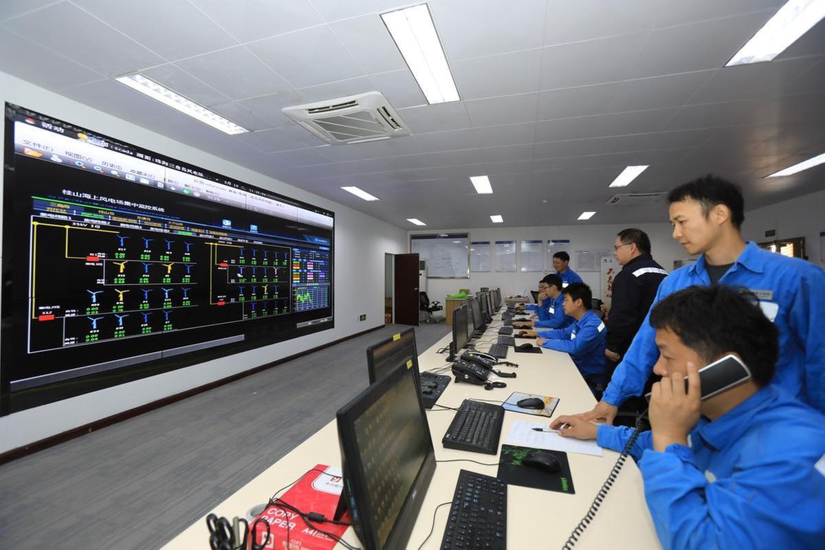 记者近日在三角岛上看到,桂山海上风电场升压站集控中心内一片忙碌景象,值班人员正在电脑前实时监控海上风机和海底电缆的运行状态。附近海面上,一台台风机排列成行,巨大的桨叶缓缓转动,在阳光照耀下熠熠生辉。