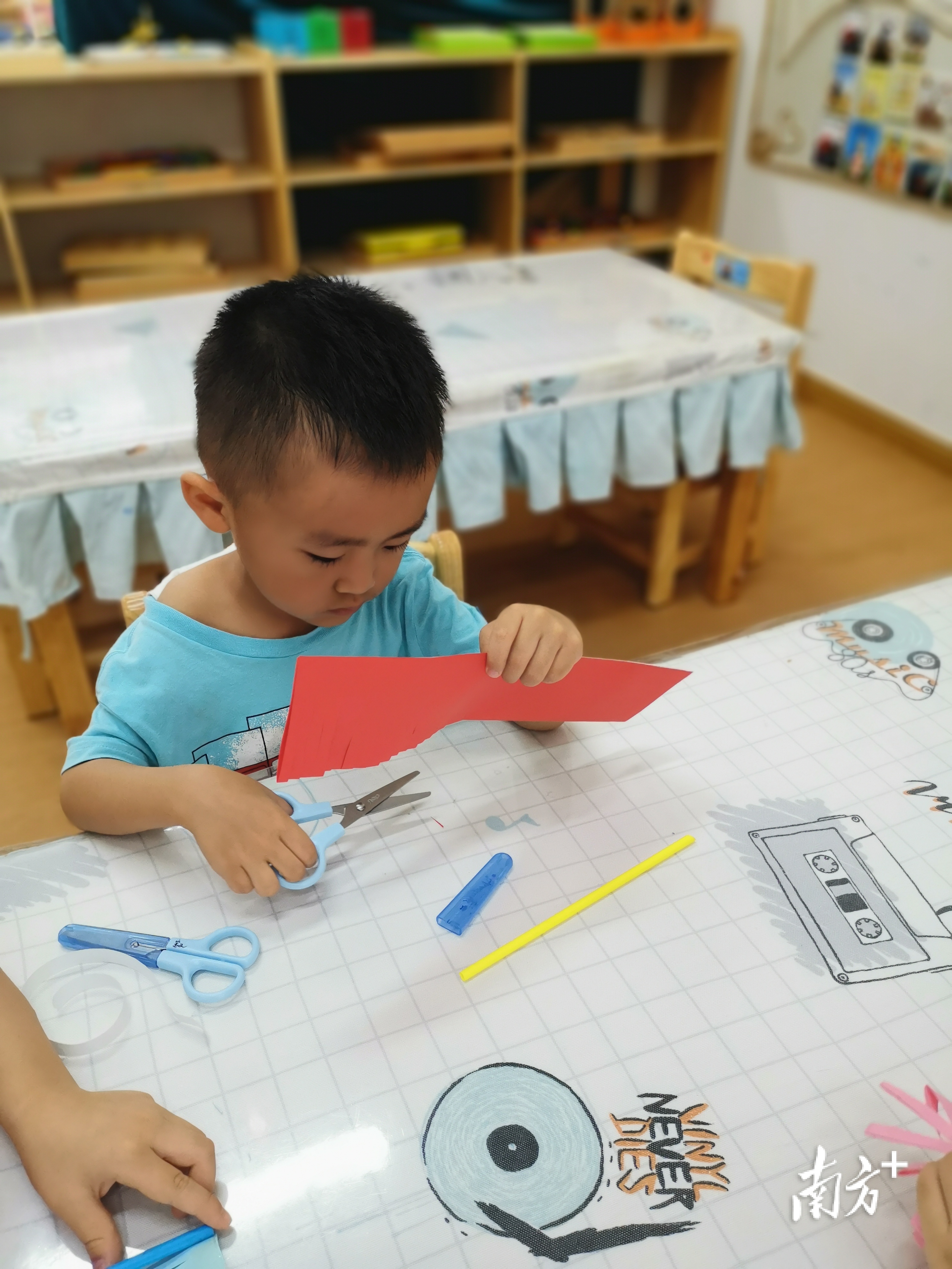 华裕幼儿园的宝宝们在老师帮助下制作卡片。