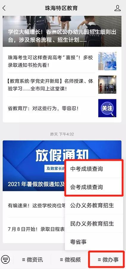 微信关注珠海市教育局官方微信公众号——珠海特区教育(微信号zhtqjygw)后,点击右下方“微办事”栏选择“中考成绩查询”或“会考成绩查询”,凭考生姓名、准考证号和密码登录查询成绩。
