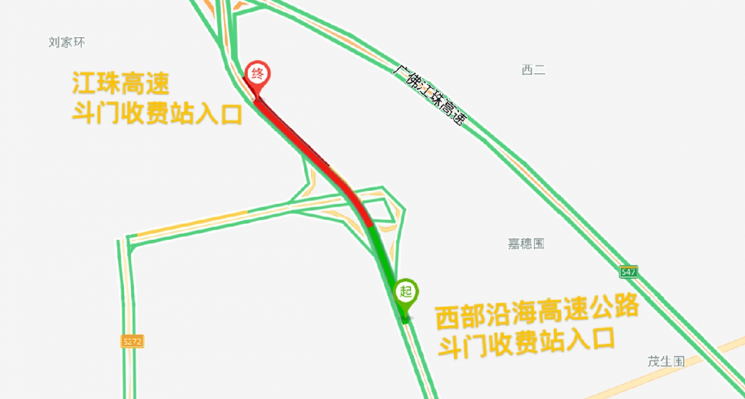 西部沿海高速公路斗门收费站与江珠高速斗门收费站同在斗门互通立交内,相距1公里。两处收费站入口在上、下班高峰时段常现拥堵。