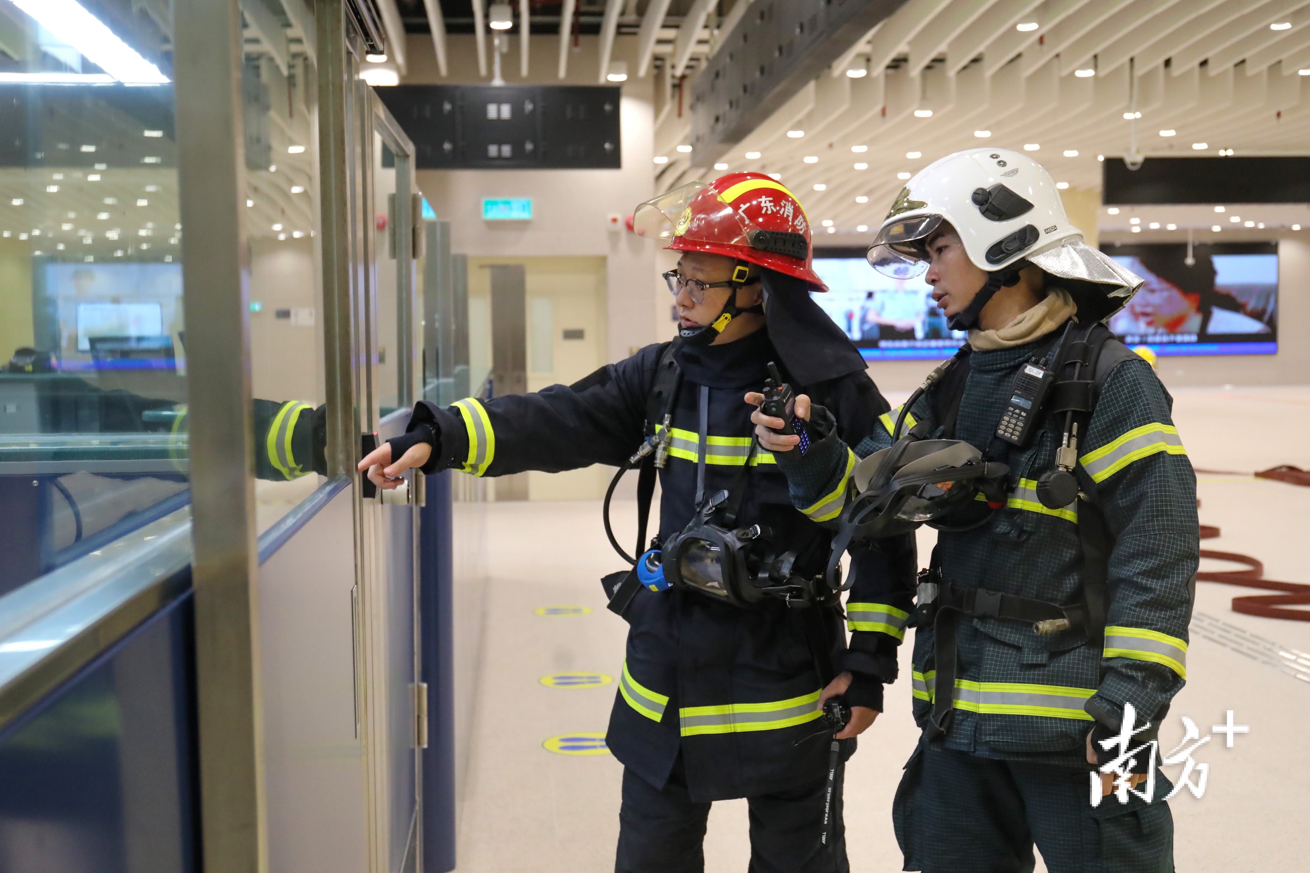 演练模拟青茂口岸联检大楼三楼澳方出境联检大厅内靠近珠澳分界线的位置,人工查验柜台的计算机突然冒烟起火并蔓延到其他位置,大量群众被困需要转移救助。现场工作人员在报警的同时,立即启动灭火救援预案,组织群众进行疏散,并通过应急广播系统播报灾情,青茂口岸联检单位内部微型消防站队员快速集结开展初期火灾扑救。由于“火势”蔓延迅速,并扩大到青茂口岸珠海方边检范围,澳门特区政府消防局和珠海市消防救援支队立即启动《粤澳紧急医疗和消防救援合作机制》,调派救援车辆和人员到场处置。