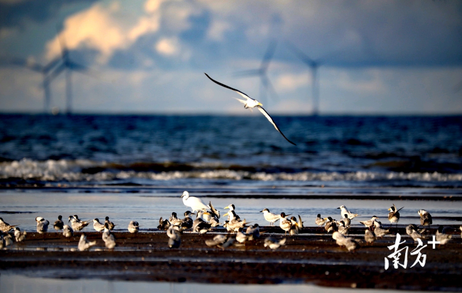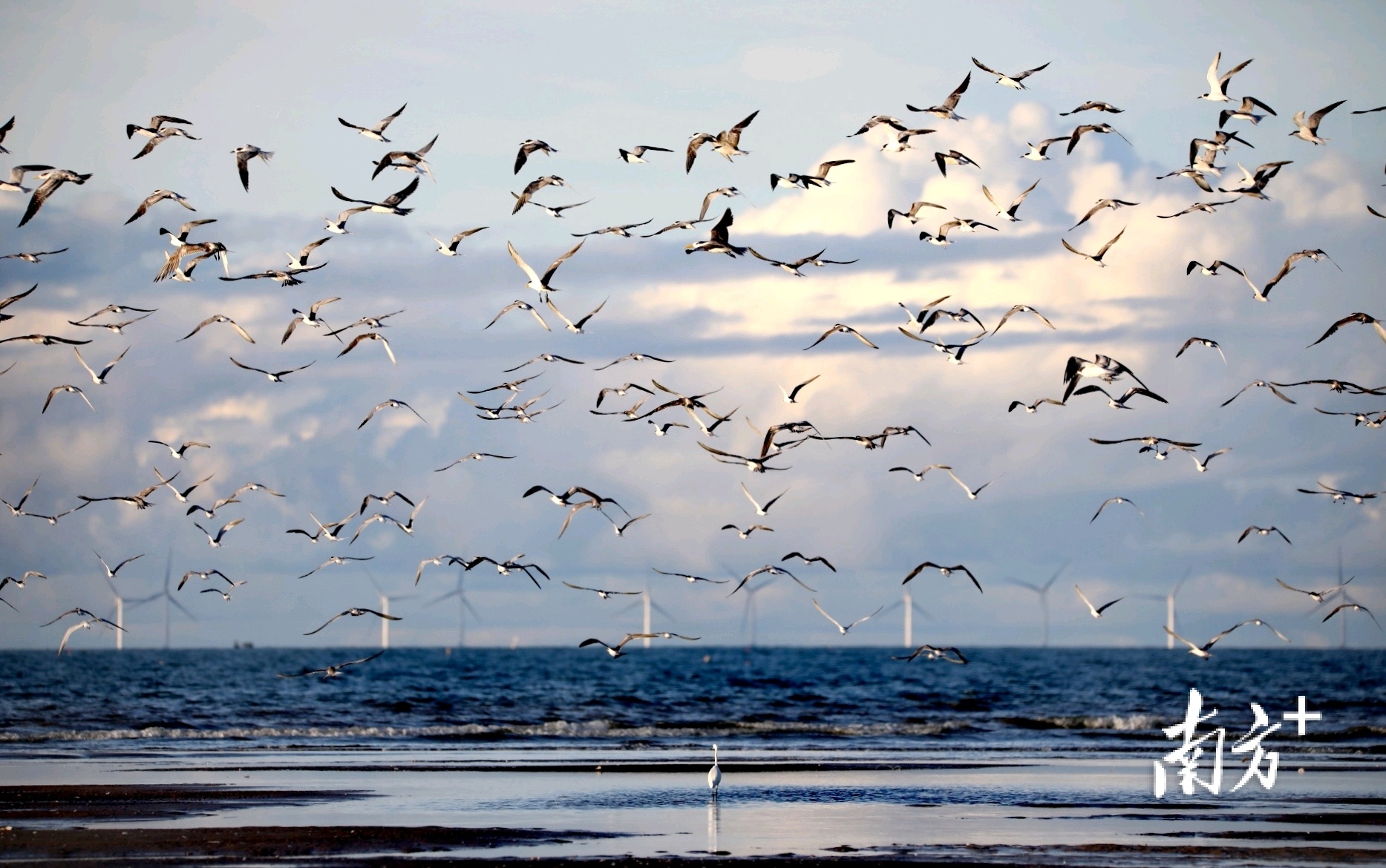 海鸥漫天飞舞,与不远处的发电风车构成一幅和谐景象 南方+ 关铭荣 拍摄