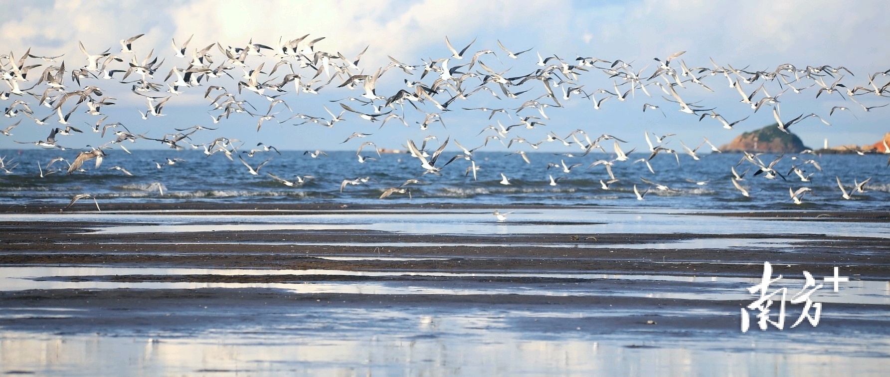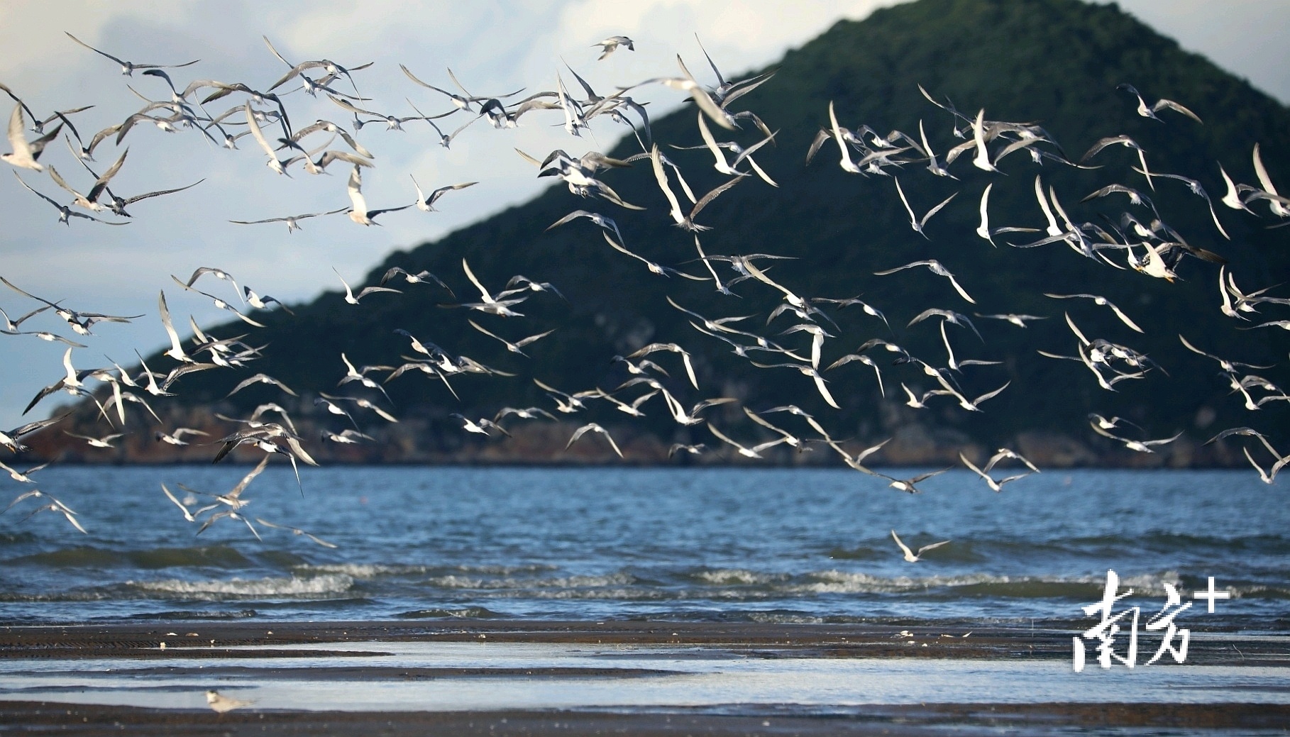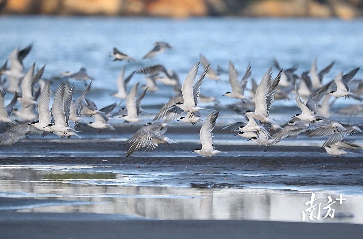 数千海鸥从沙滩上同时起飞,场面十分壮观 南方+ 关铭荣 拍摄