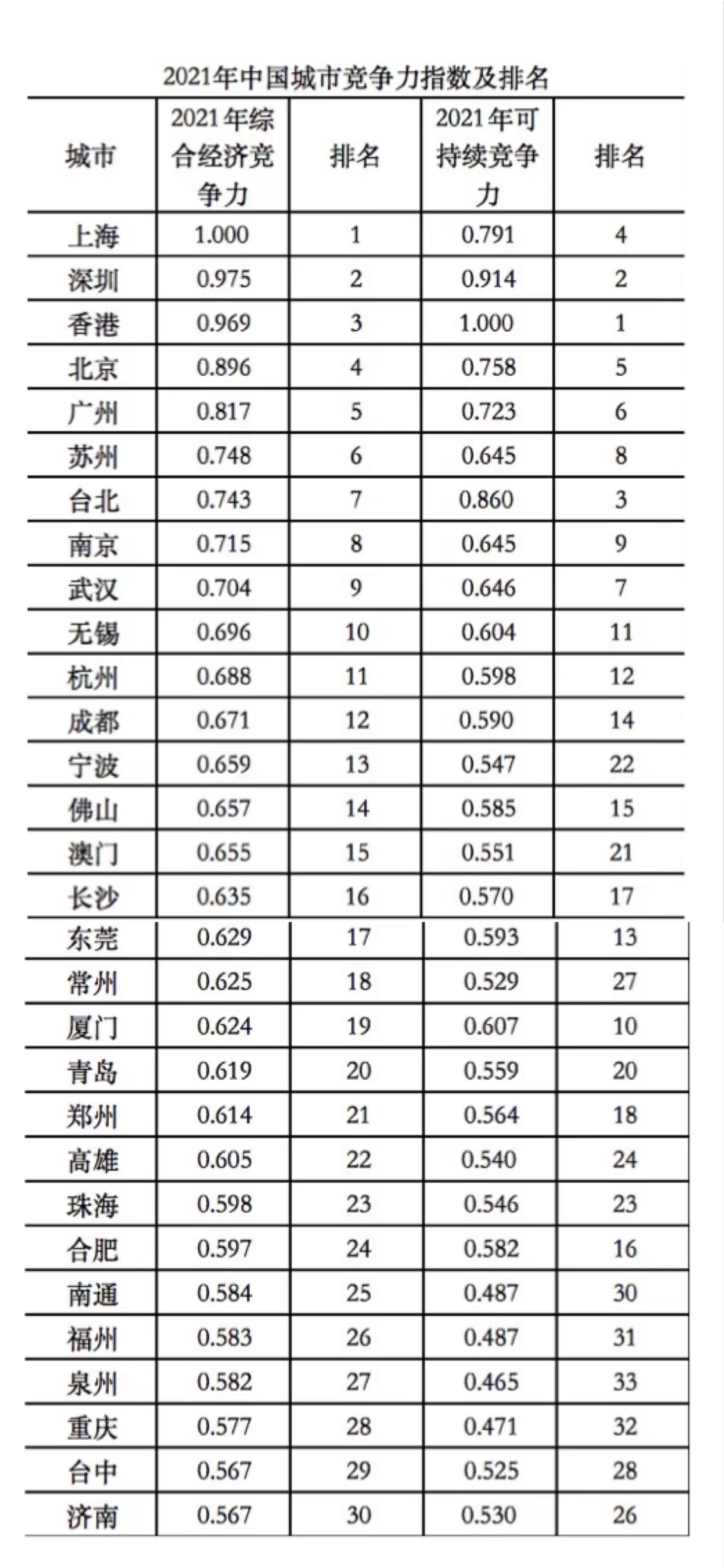 11月2日下午,中国社科院财经战略研究院与中国社会科学出版社在北京共同发布了《中国城市竞争力报告No.19》(以下简称“报告”),对中国内地和港澳台地区291个城市的综合经济竞争力进行评价研究。其中,2021年中国城市竞争力表现最为突出的五大城市为上海、北京、深圳、香港、广州。