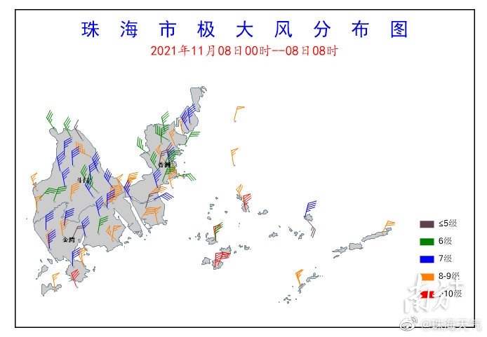 珠海市气象台于11月7日23时20分发布珠海市雷雨大风黄色预警信号,表示6小时内本地受雷雨天气影响,平均风力可达6级以上,或者阵风8级以上,并伴有强雷电;或者已经受雷雨天气影响,平均风力达6-7级,或者阵风8-9级,并伴有强雷电且将持续。随后,珠海市气象台于11月8日6时30分解除珠海市雷雨大风预警信号。