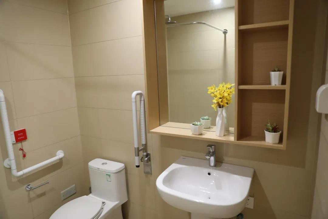 小布在现场看到,该项目很多设计细节,都充分考虑了老年人生活的便利性和安全性:室外有阶梯的地方均设置了无障碍通道,楼道所有走廊都装有高低两层扶手,方便不同身高的老人支撑;室内一键报警系统、床头的吸氧设备、卫生间的无障碍设施、24小时恒温系统等也一应俱全。