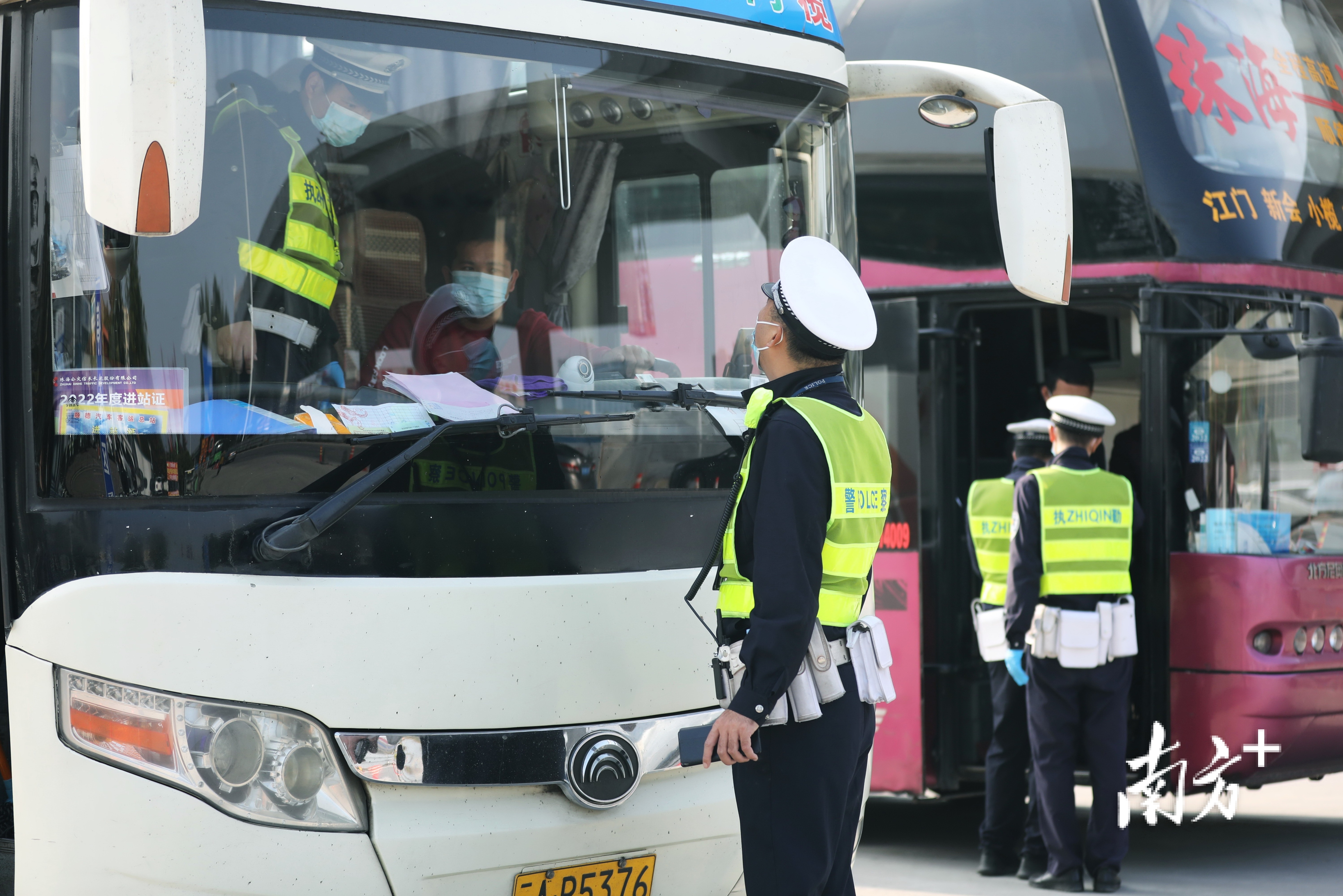 珠海交警在上冲春运执勤点排查出城大巴车。