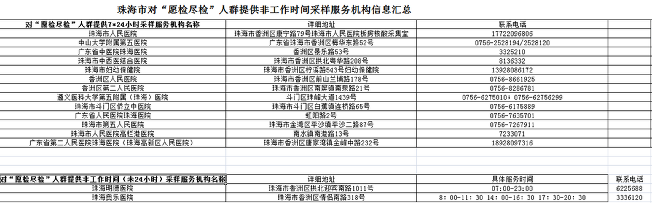 为方便因个人需要,需自行做核酸检测的人群进行核酸检测采样,珠海市设立24小时核酸检测采样点,对“愿检尽检”人群提供24小时核酸检测采样服务,1月15日晚,珠海市卫健局公布具体核酸采样服务机构名单。