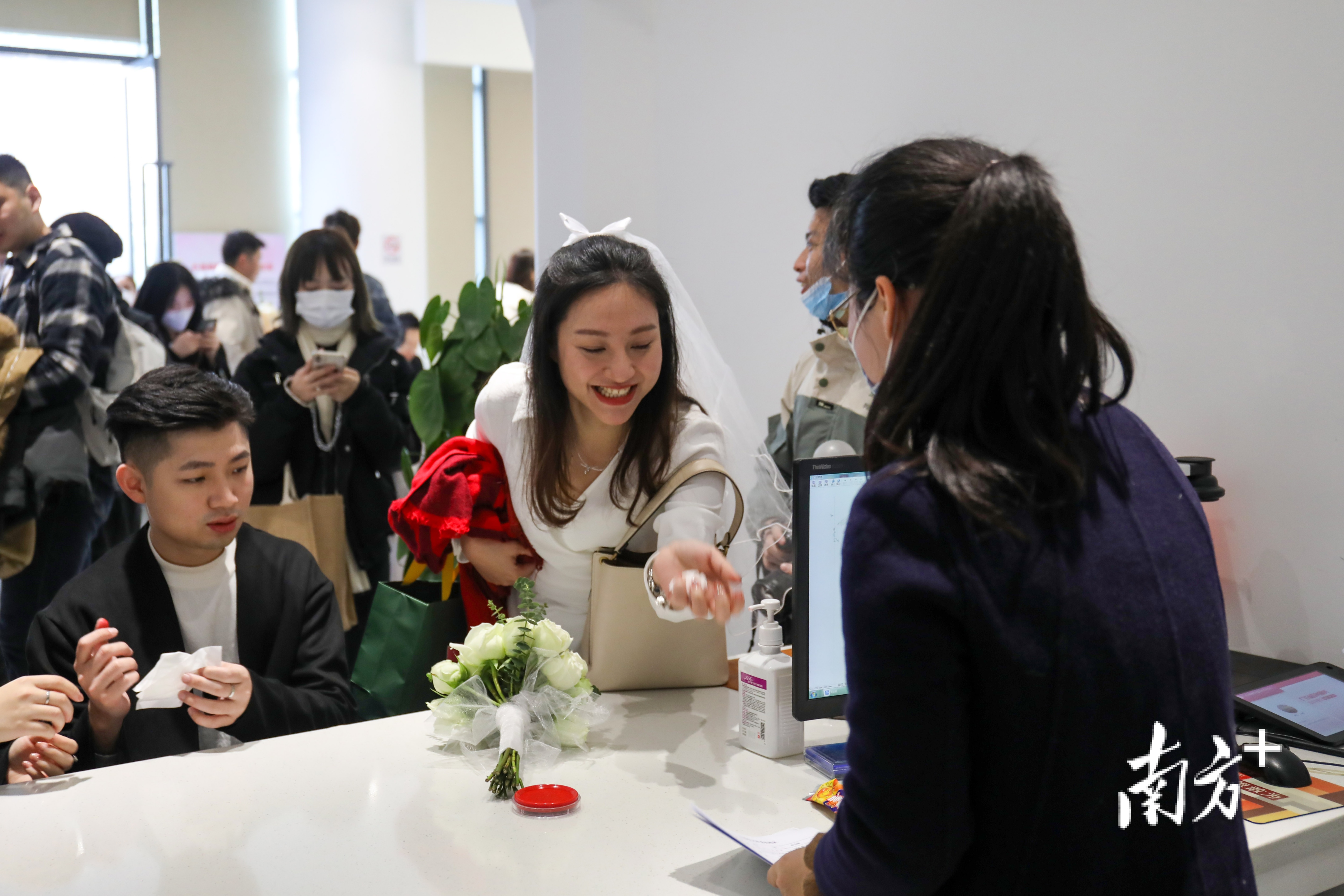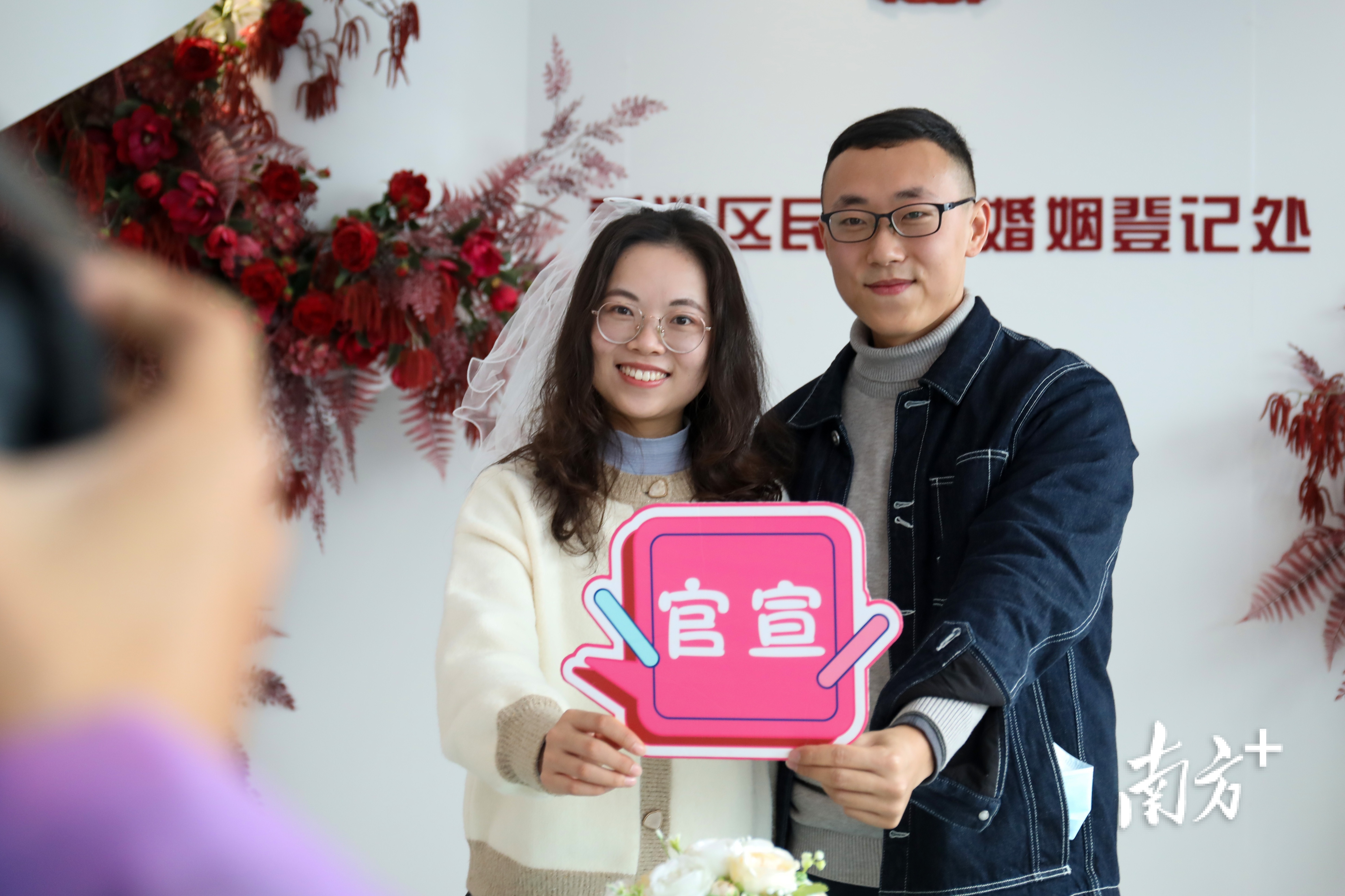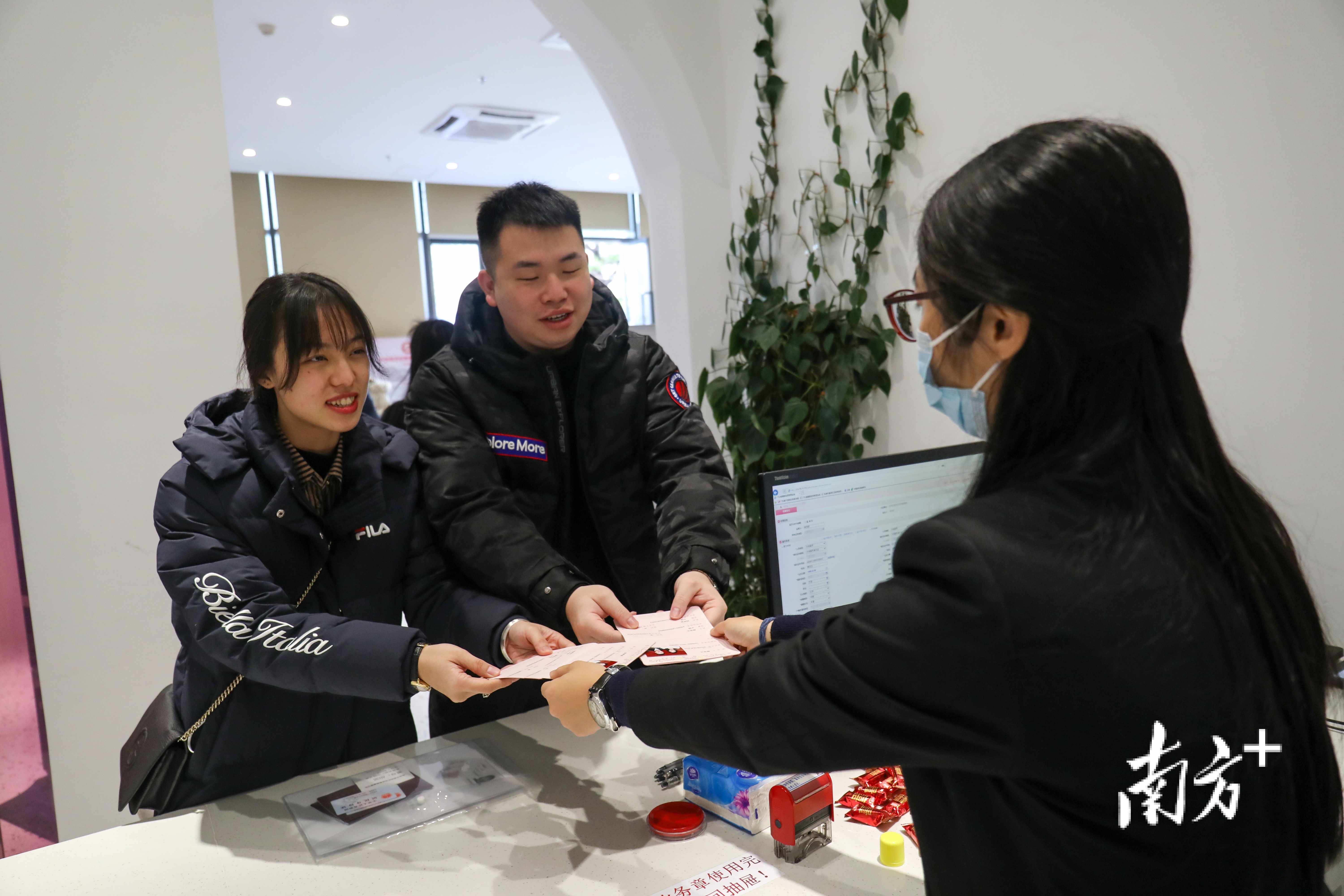 激动,红本本到手!工作人员向两位新人发证。 南方+ 钱文攀 拍摄