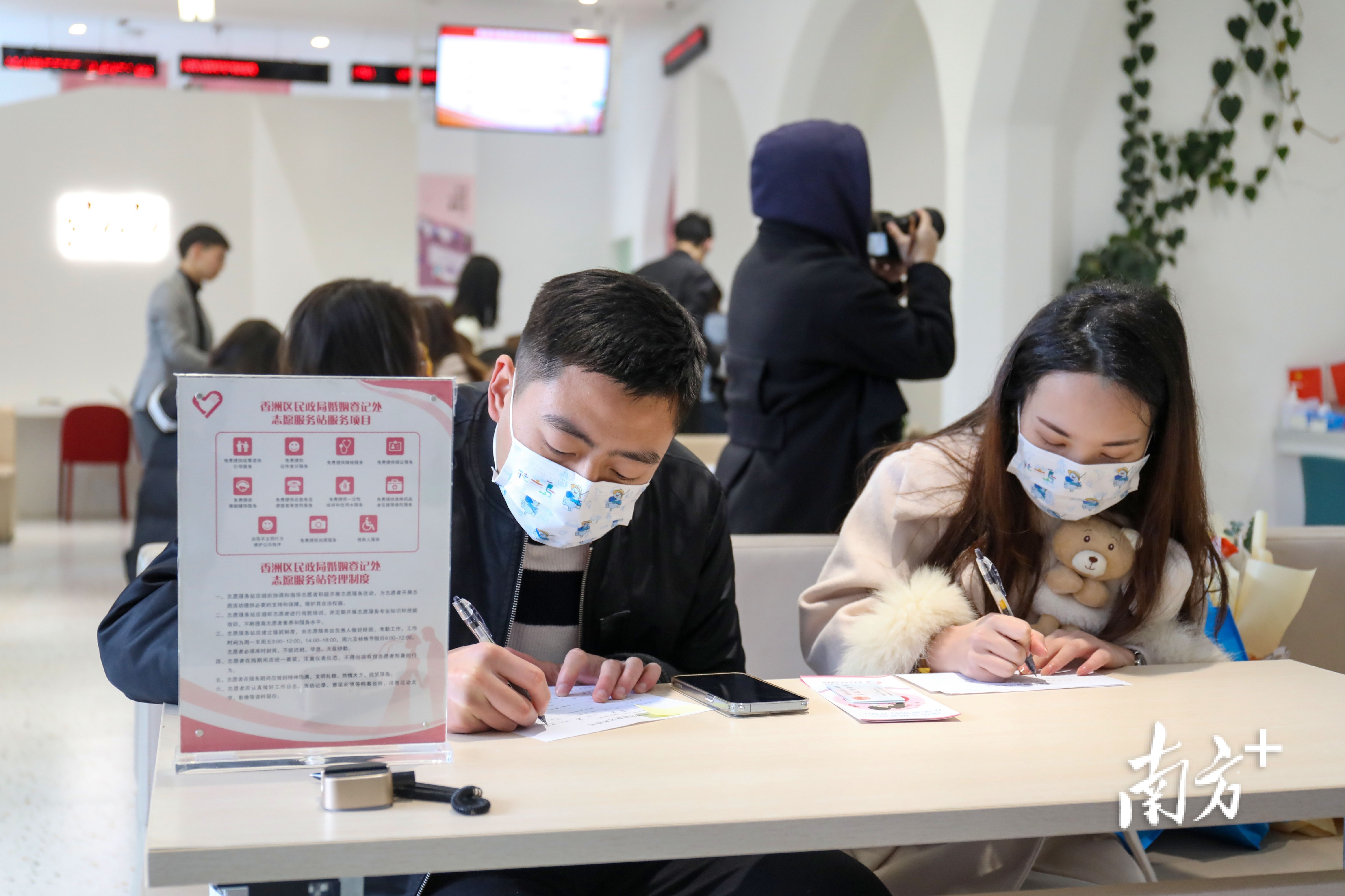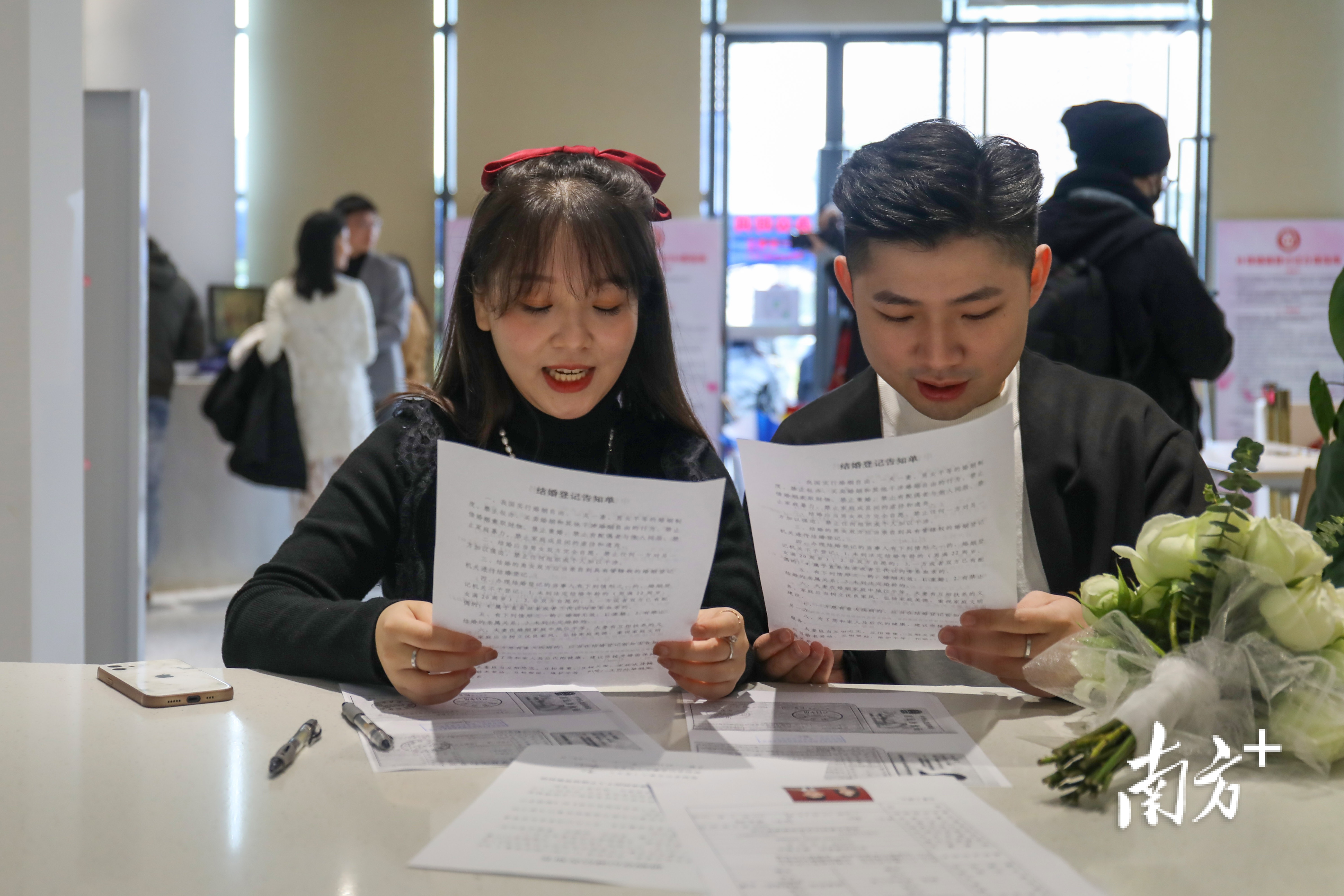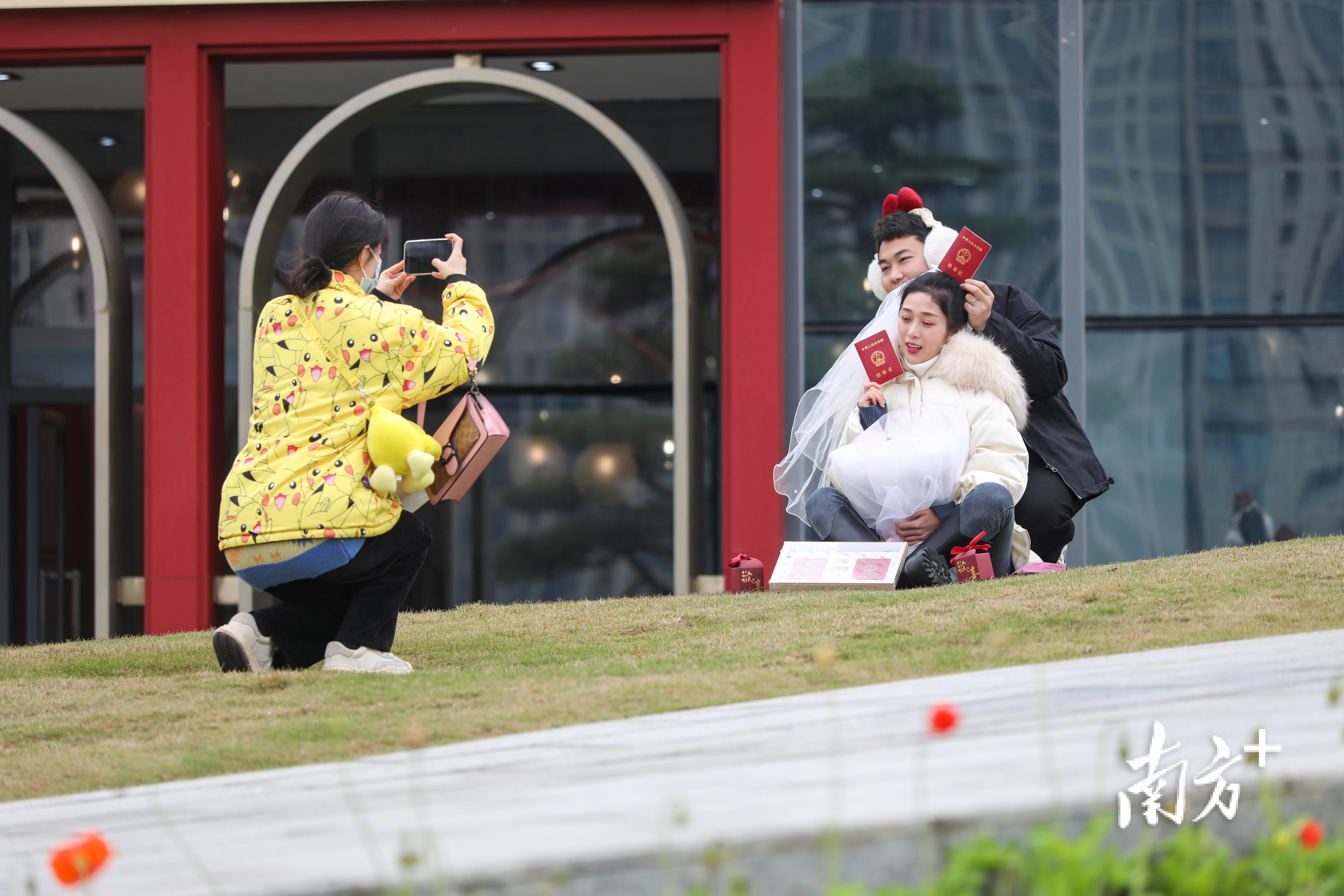 激动,红本本到手!工作人员向两位新人发证。 南方+ 钱文攀 拍摄