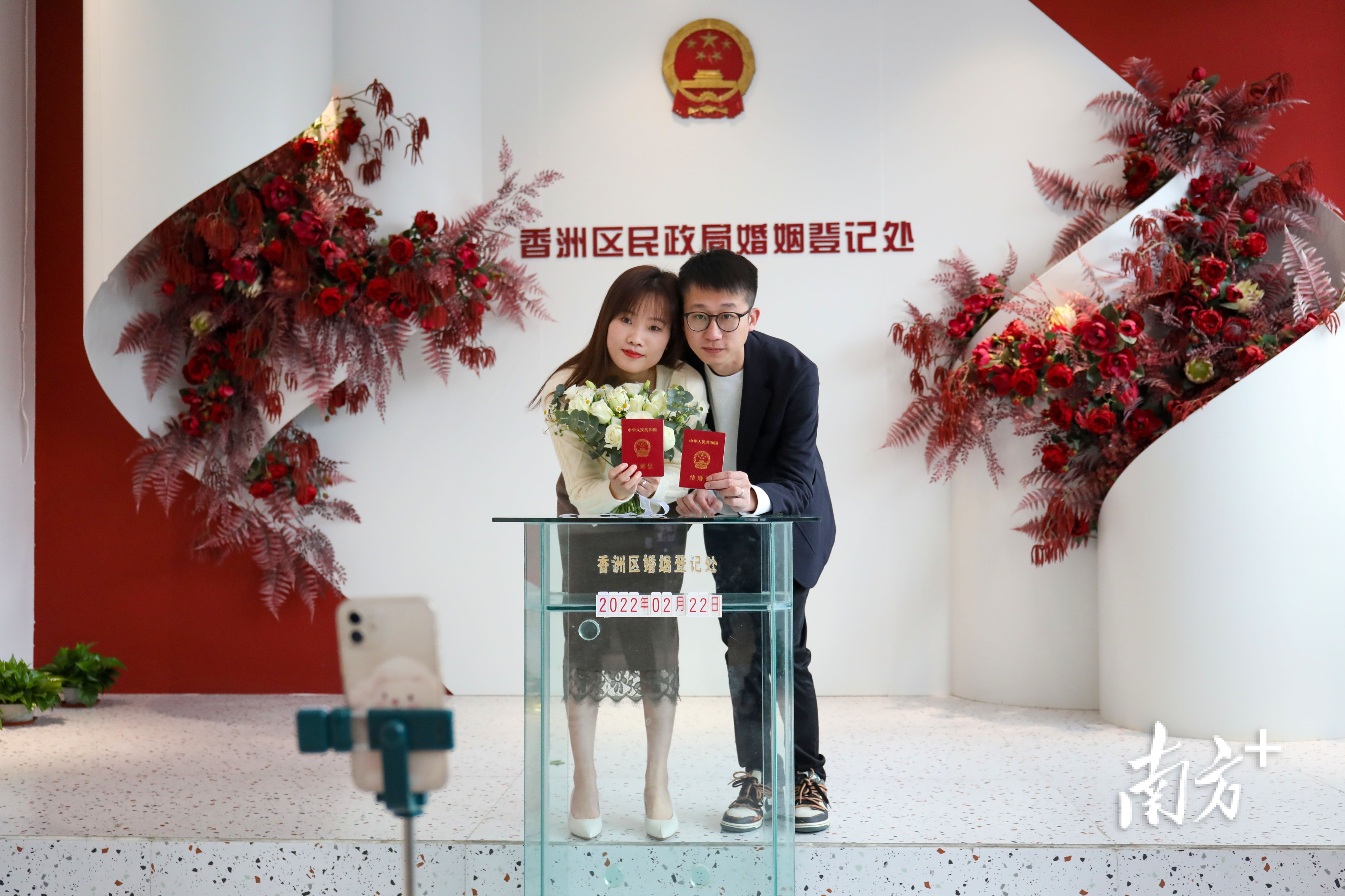 “两人亲密点,结婚证靠一起。”2月22日上午,在珠海市香洲区民政局婚姻登记处,一对新人的父母专程赶来见证儿子与儿媳领结婚证的幸福时刻,二人特意穿着一身红衣服,妈妈忙着拍照,爸爸忙着指导造型,一家人忙得不亦乐乎。