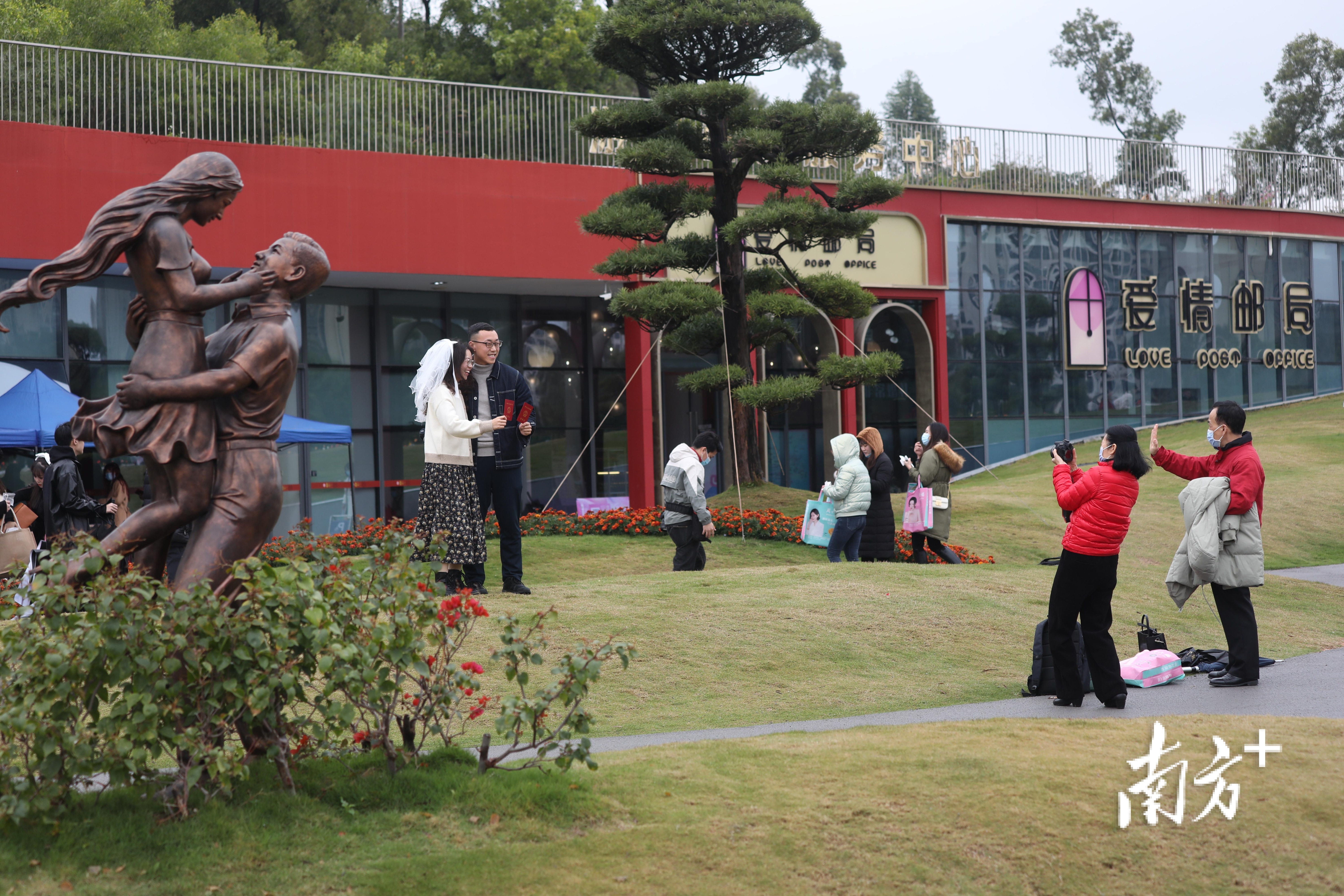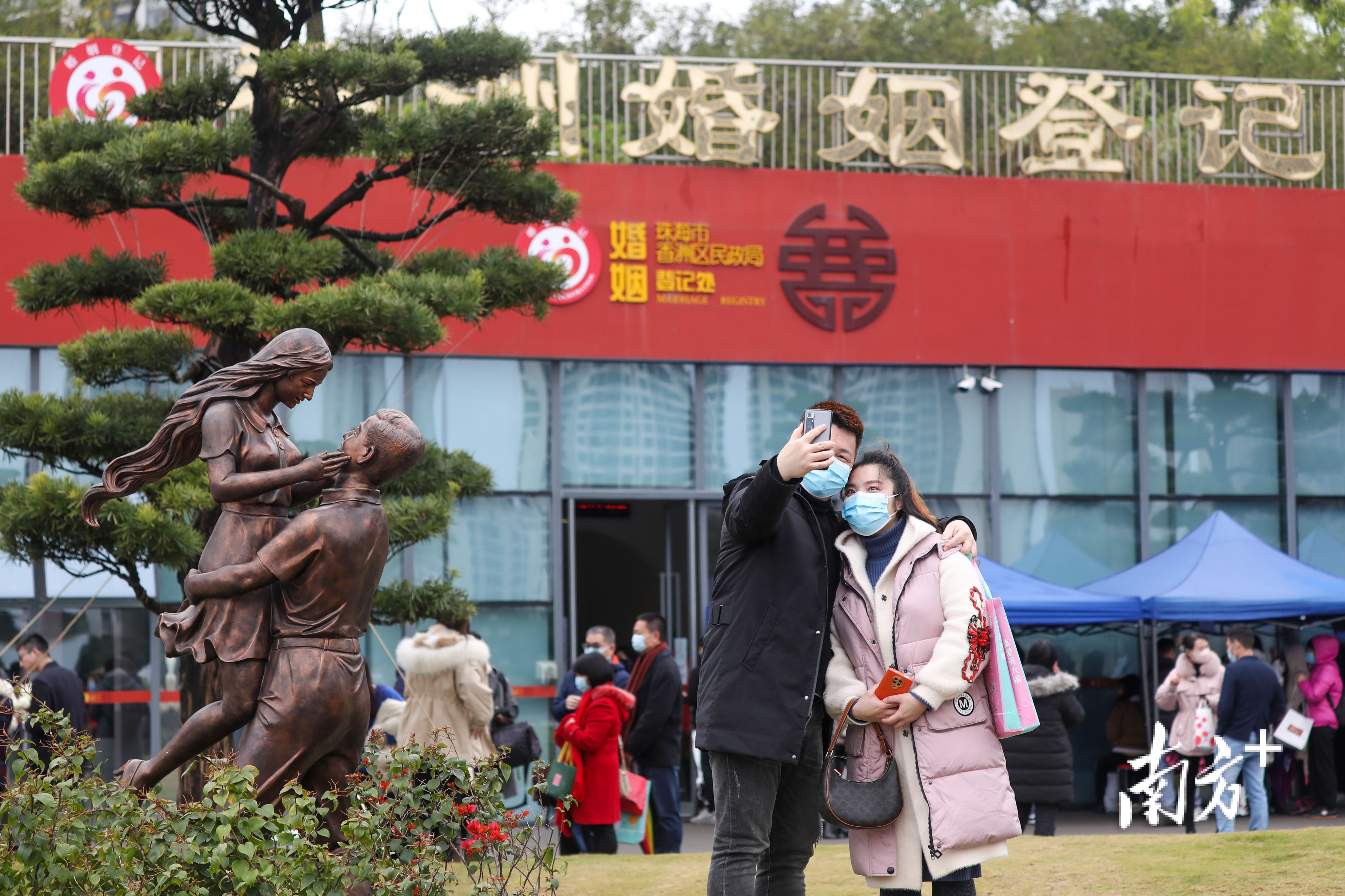 刚领完证的新人在婚姻登记处门口留影。 南方+ 钱文攀 拍摄