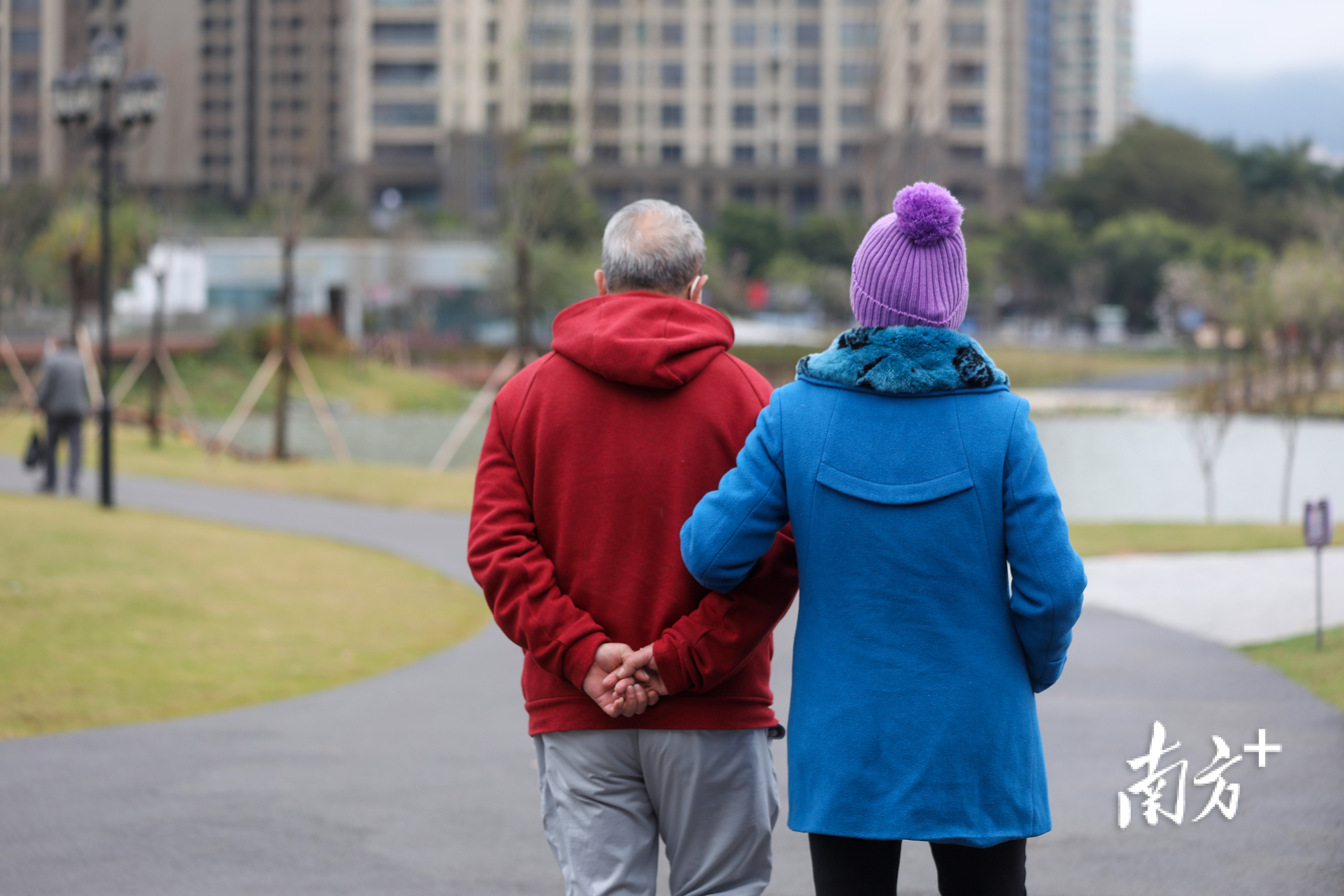 一对头发花白的老人挽着手在结婚登记处旁的公园里散步。 南方+ 钱文攀 拍摄