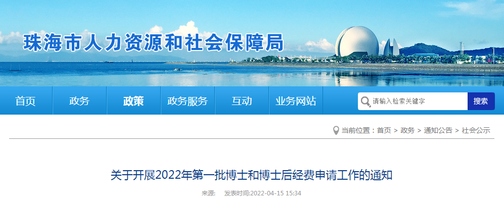4月15日,珠海市人力资源和社会保障局发布《关于开展2022年第一批博士和博士后经费申请工作的通知》,经珠海申报设立的博士工作站、博士后科研工作站(分站、基地),市属各单位(不含在珠高校)新引进博士博士后个人,符合条件均可申请经费。