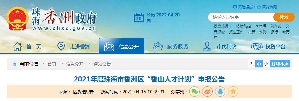 为加快实施人才强区战略,集聚现代产业人才,推动香洲区产业转型升级,4月15日,中共珠海市香洲区委组织部发布《2021年度珠海市香洲区“香山人才计划”申报公告》。