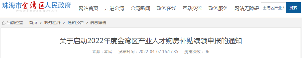 4月7日,珠海市金湾区人力资源和社会保障局发布《关于启动2022年度金湾区产业人才购房补贴续领申报的通知》。