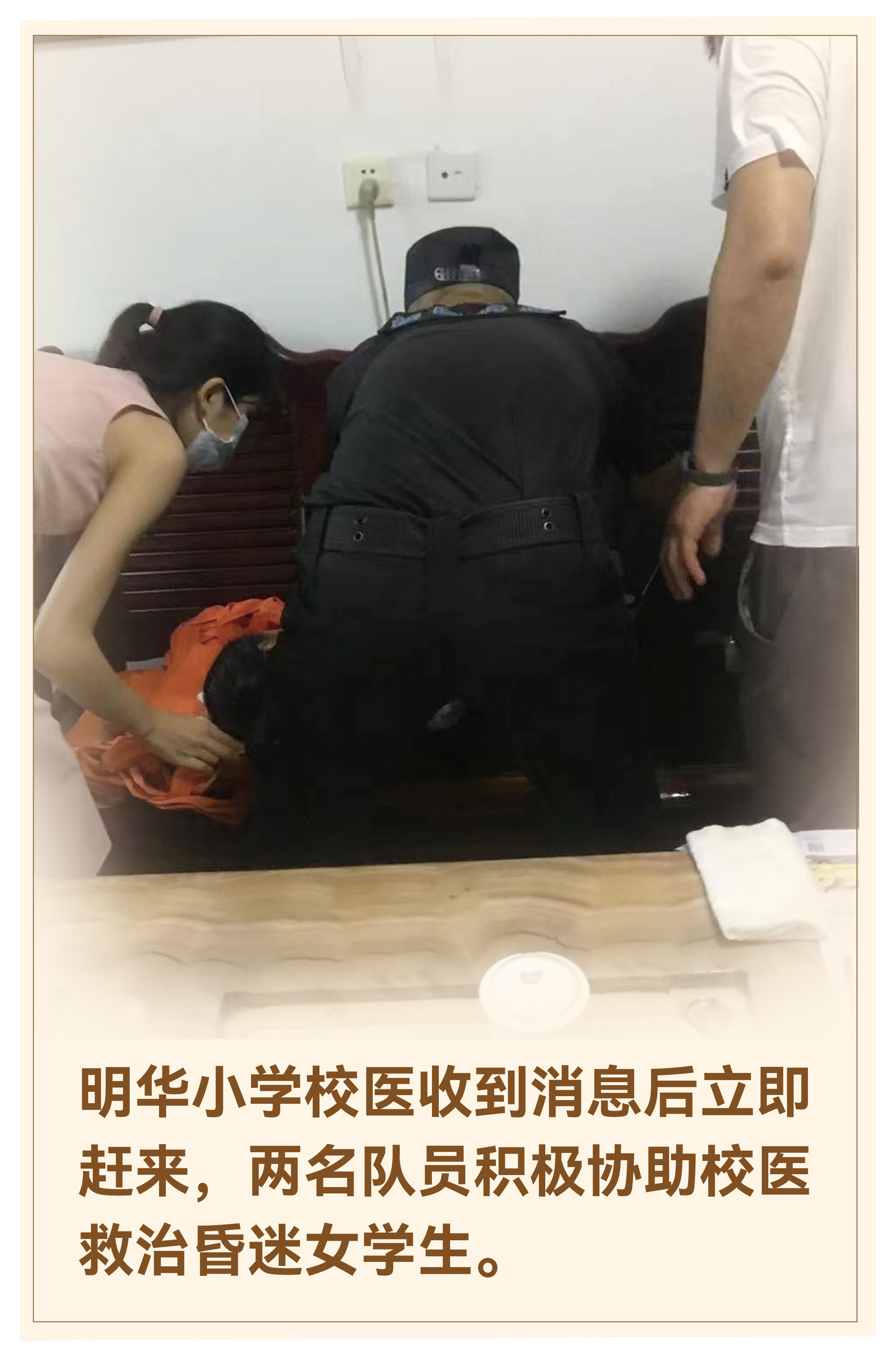 女学生被送入校内依然昏迷不醒,两名特保员协助女校医对其进行了救治。