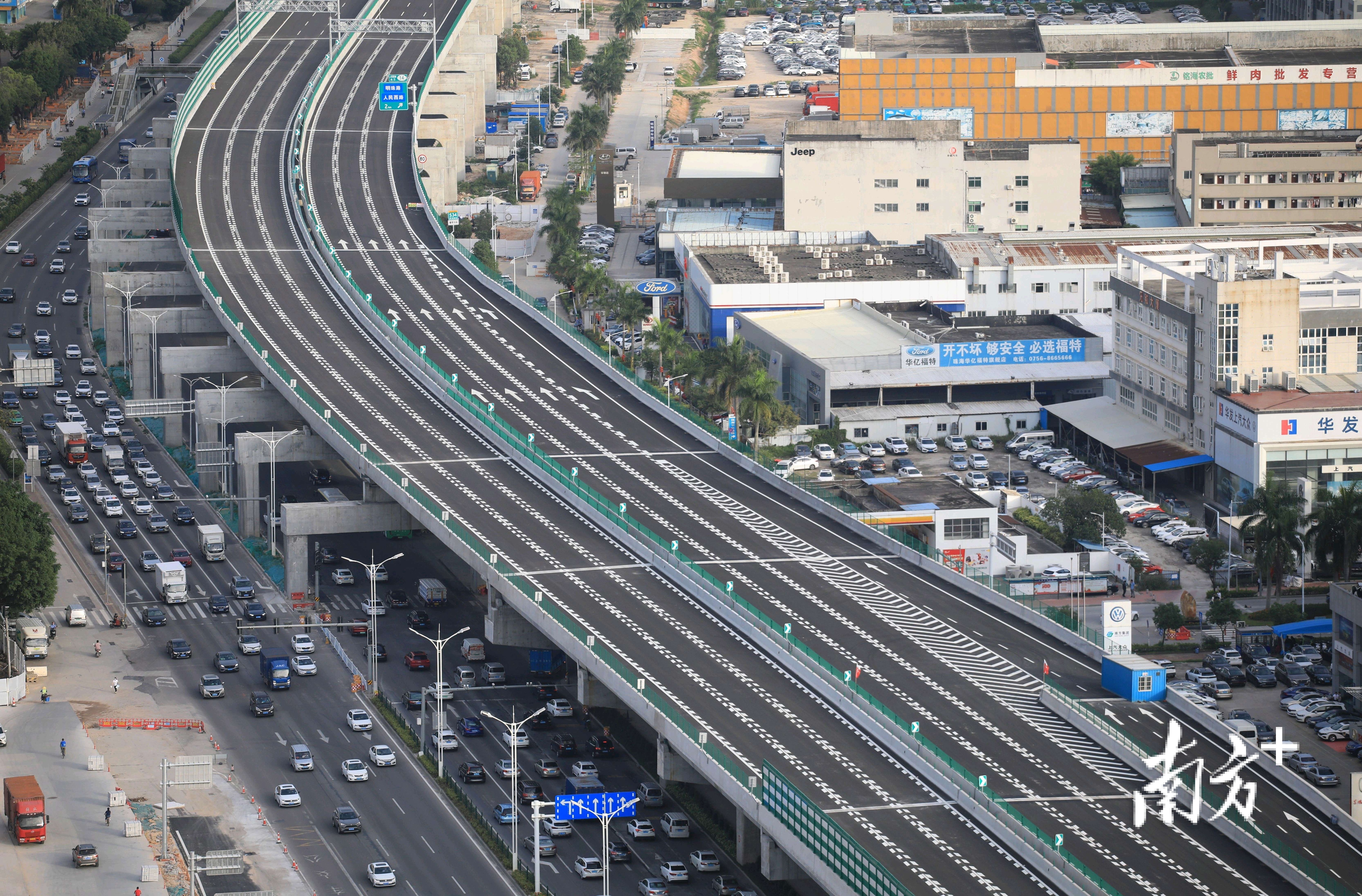 香海大桥支线工程,在珠海主城区穿城而过,上冲至坦洲枢纽互通路段也已完成沥青铺设、道路划线等。 南方+ 关铭荣 拍摄