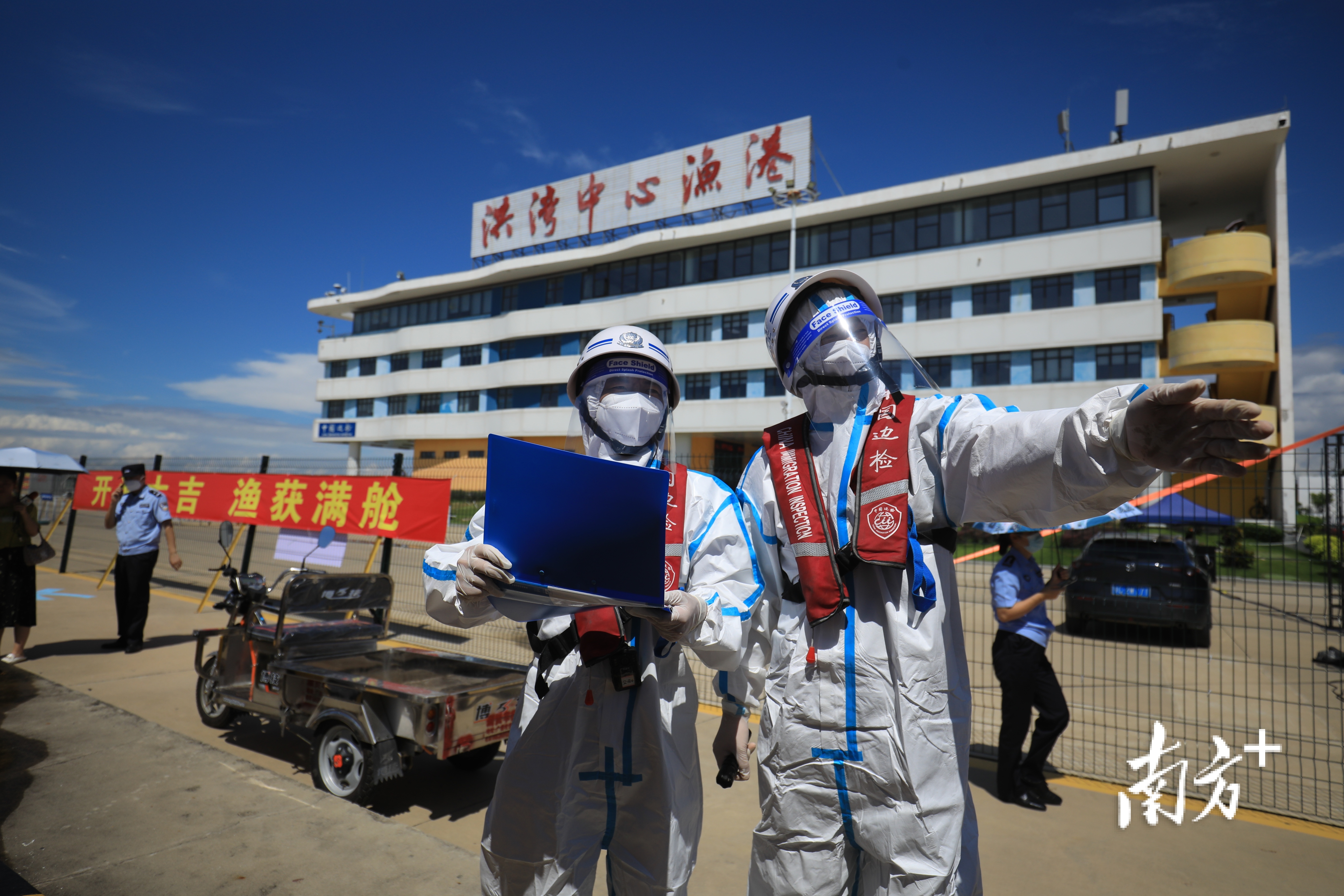 在洪湾中心渔港的港澳流动渔船查验现场,边检执勤民警从早上6时许便穿戴全套防护用具,开始对出港开渔的港澳流动渔船渔民开展候检监管、人证对照、船体检查等出入境查验措施,并在查验的过程中积极向船上渔民就出入境相关法律法规及疫情防控要求作重点提醒,确保开渔后海上出入境秩序和疫情防控安全稳定,助力港澳流动渔船民开渔复工“零等待”。
