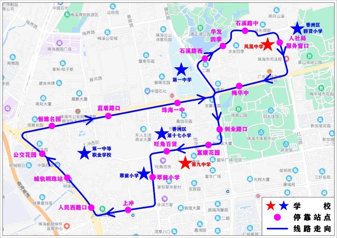 珠海一中-梅华路-敬业路-梅界路-新溪路-健民路-石溪路-红山路-人社局服务窗口(凤凰中学)-红山路-梅华路-珠海一中