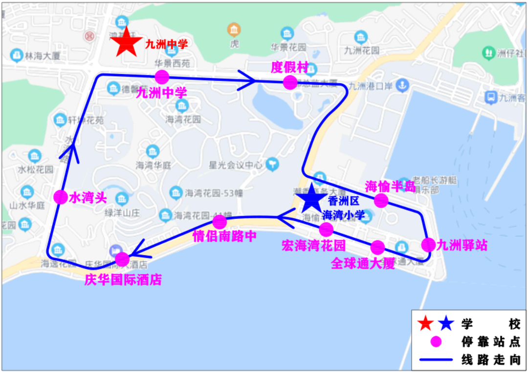 (早高峰)水湾头、九洲中学、度假村、海愉半岛、九洲驿站、全球通大厦、宏海湾花园、情侣南路中、庆华国际酒店、水湾头