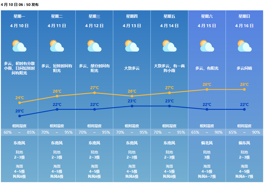 新的一周,珠海进入升温通道,最高温将升至28℃,但饱含水汽的偏南风再次出现,这也意味着“暖湿”将是本周天气主基调。