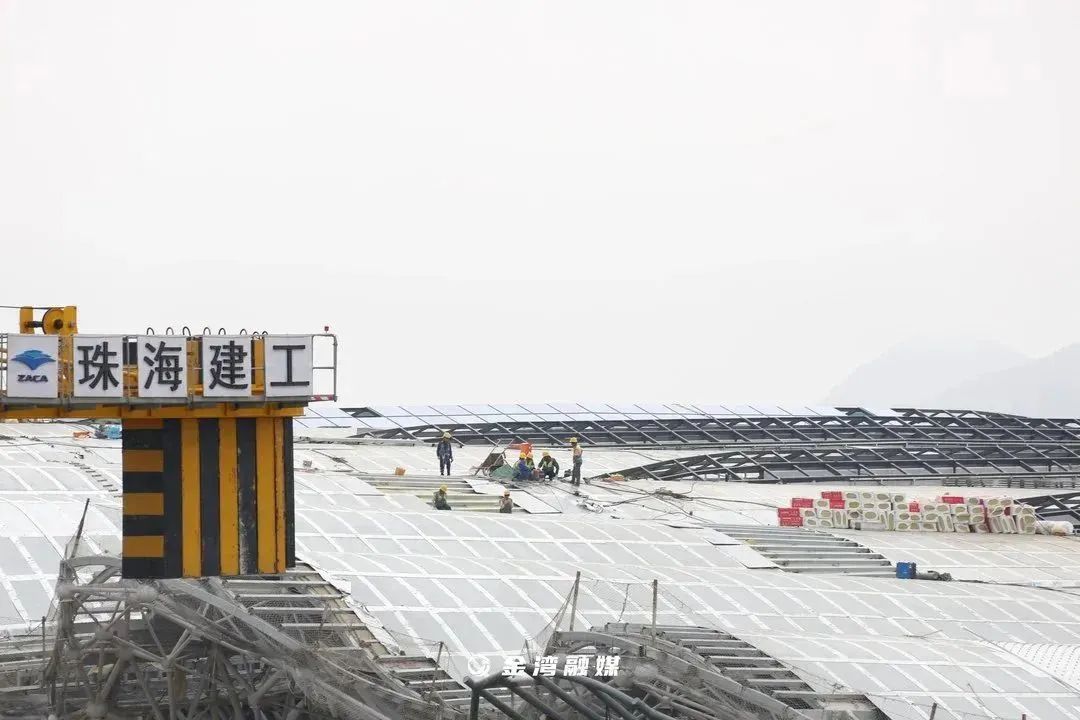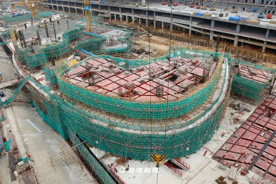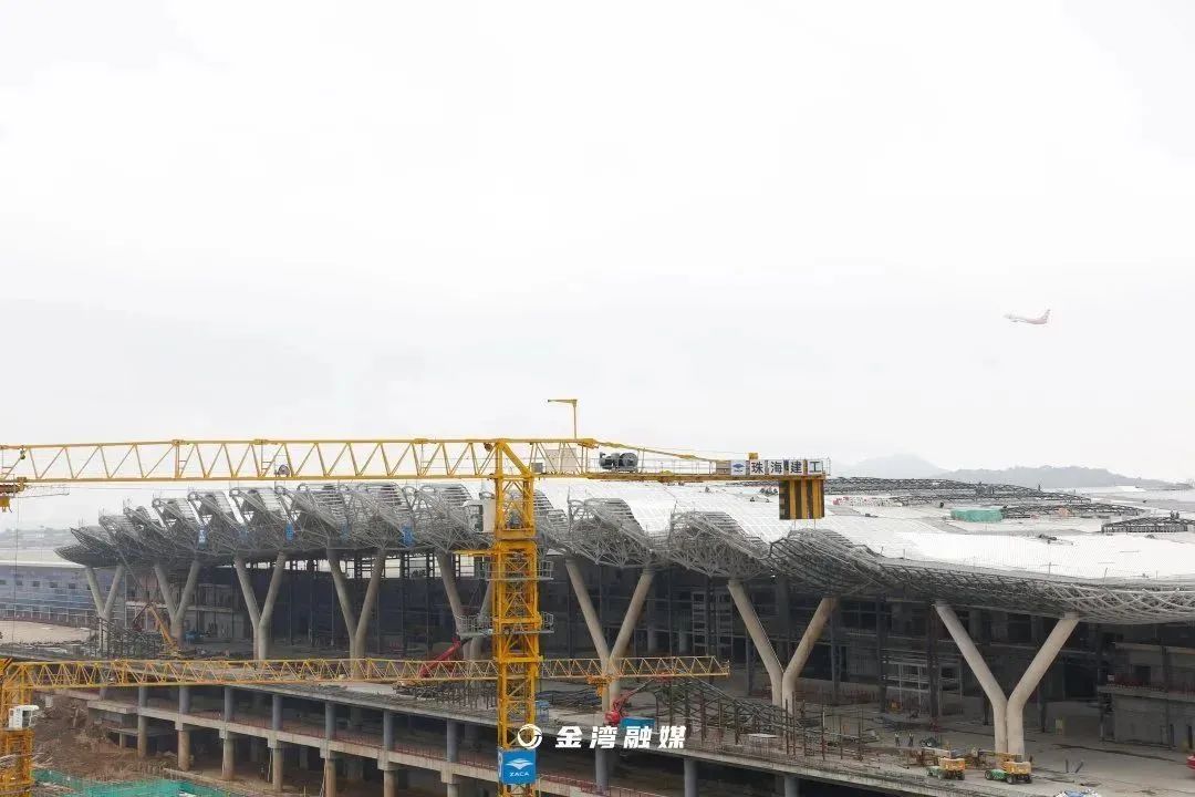 T2航站楼一侧,珠海机场综合交通枢纽项目一期工程主体结构封顶在即。作为珠海市“十四五”重点建设工程项目,总投资80.49亿元、总建筑面积58.1万平方米的珠海机场综合交通枢纽项目,于2021年开工建设。