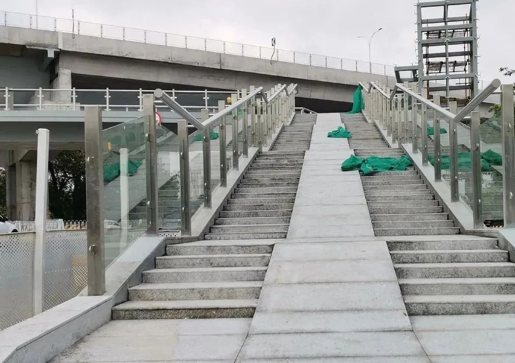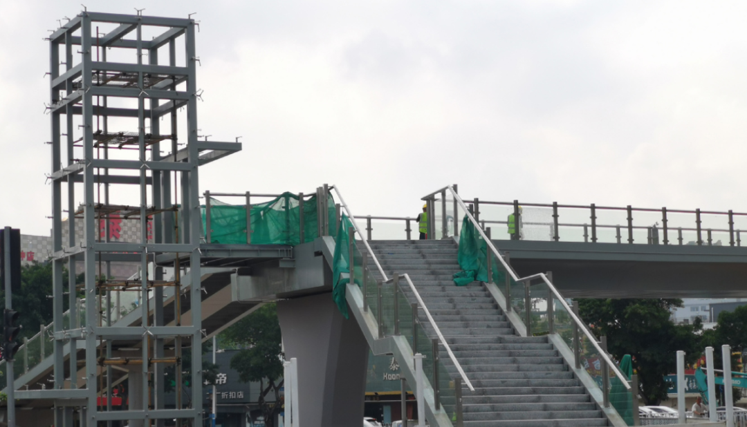 口天桥即将投入使用,施工人员正在进行最后的收尾工作
