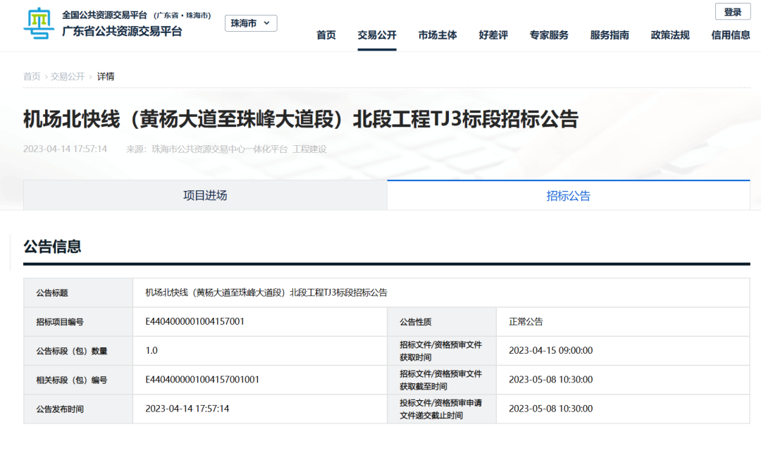 近日,珠海市公共资源交易中心发布《机场北快线(黄杨大道至珠峰大道段)北段工程TJ3标段招标公告》。