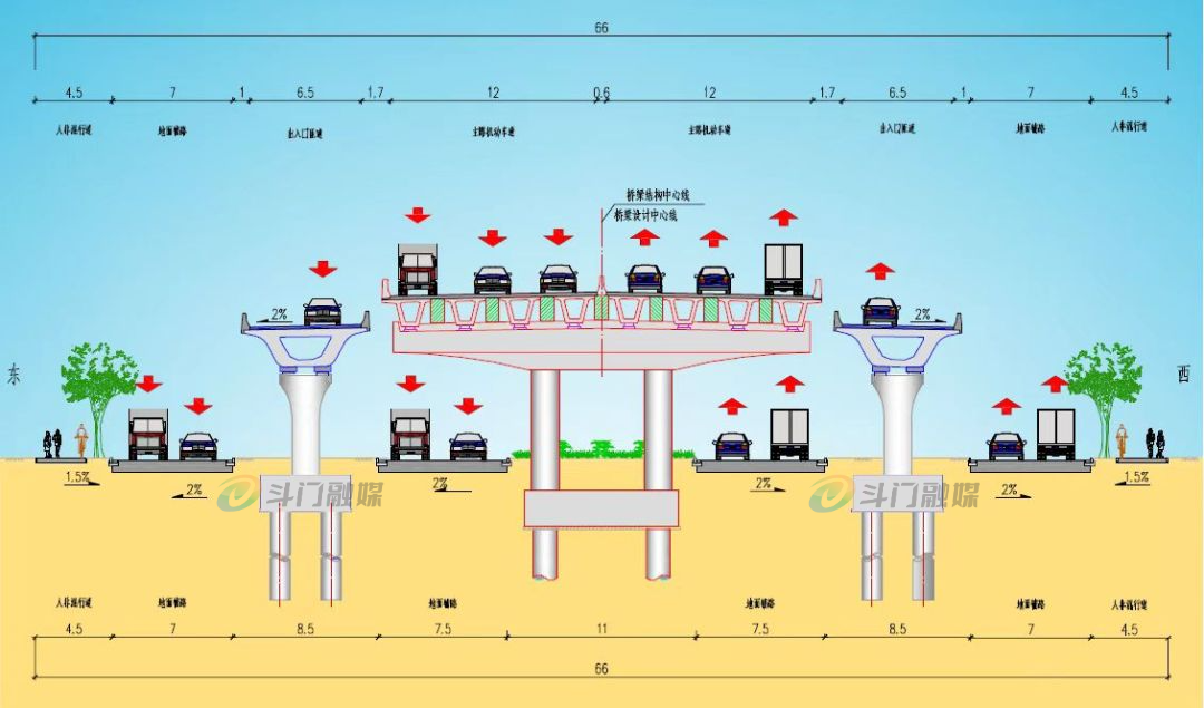 项目道路等级为城市快速路,采用连续高架桥梁形式敷设,桥下设置辅道,主线标准断面为双向6车道+辅路双向4车道。