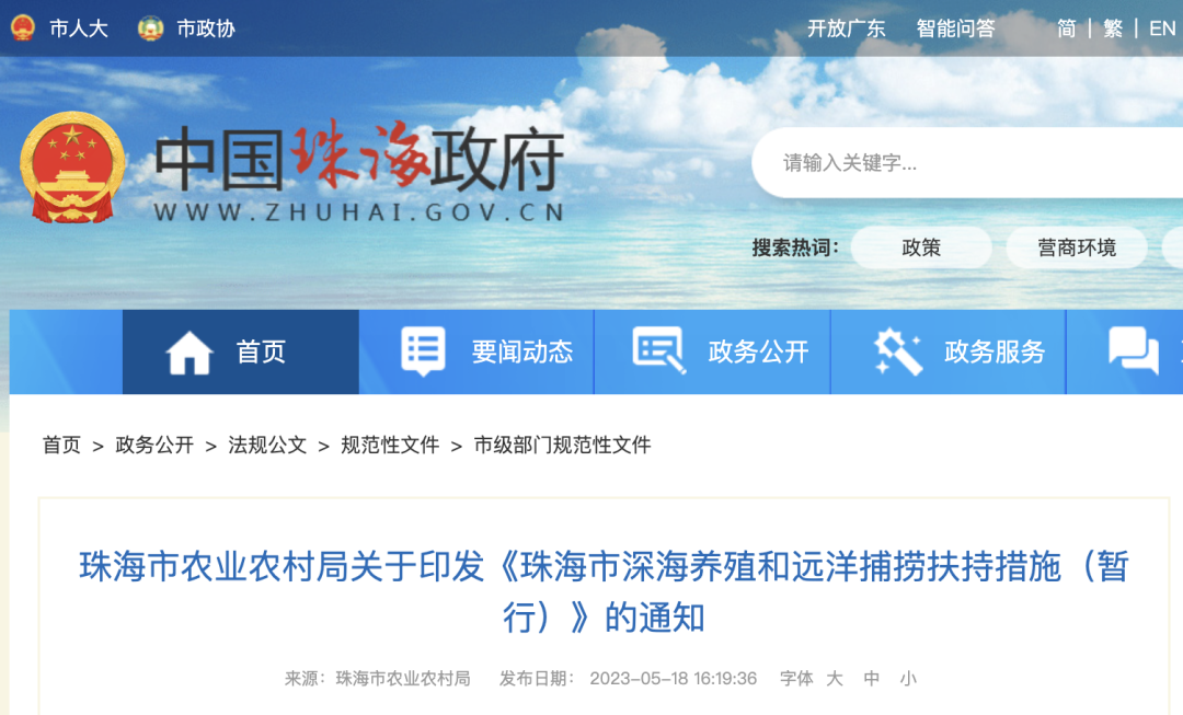 近日,珠海市农业农村局印发《珠海市深海养殖和远洋捕捞扶持措施(暂行)》(以下简称《措施》)。