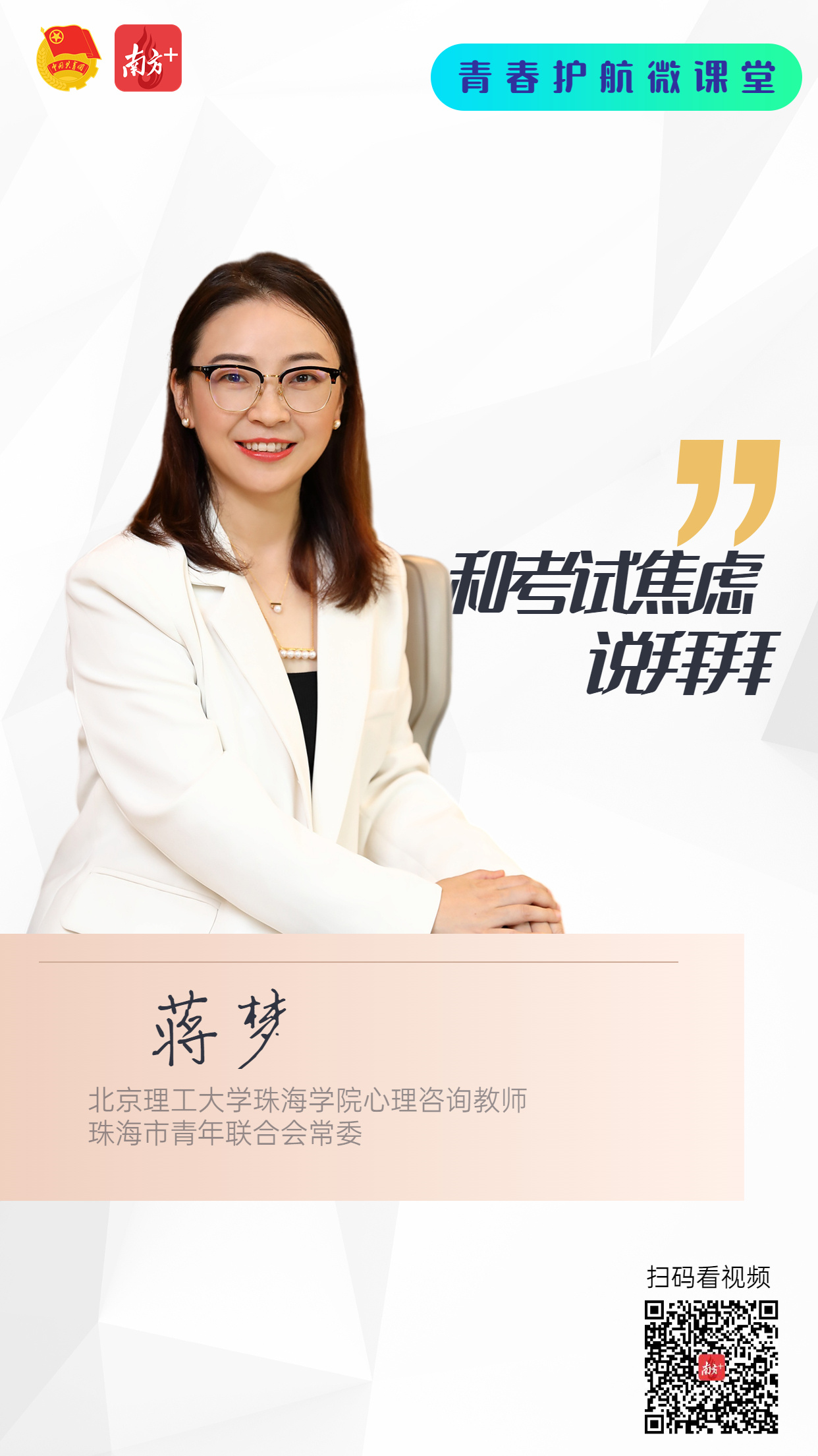 南方报业传媒集团珠海分社联合共青团珠海市委员会共同推出青春护航微课堂,本期微课堂主题为“和考试焦虑说拜拜”,今天,我们请来了北京理工大学珠海学院心理咨询教师、珠海市青年联合会常委蒋梦,跟大家介绍一些情绪调节的锦囊妙计,让我们一起走进本期微课堂!