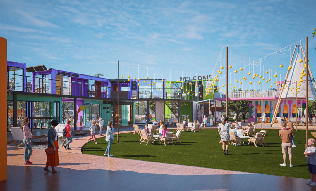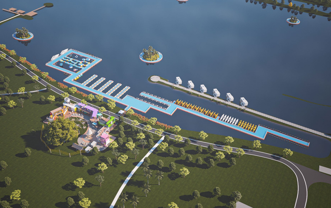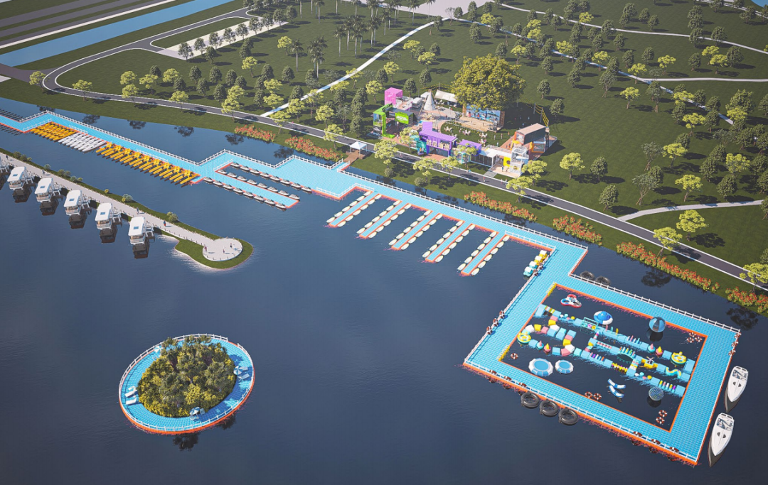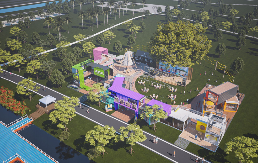 陆地市集搭配有户外影吧、水上运动俱乐部、餐饮小食、主题场景打卡点、音乐live等吃喝玩乐一站式的业态规划,丰富园区的整体功能活动体验感,打造面向全龄段水上主题嘉年华。