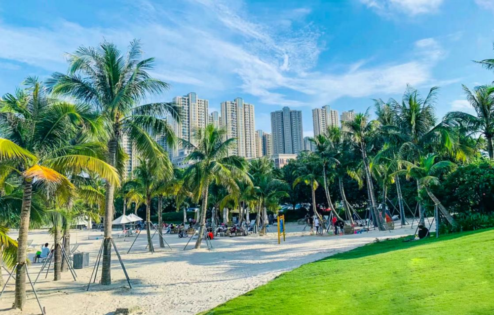 洁白无瑕的白沙滩与蔚蓝大海相接,岸边的棕榈树随着微风摇曳,搭配上遮阳伞就能在绿洋湾公园感受热带风情!