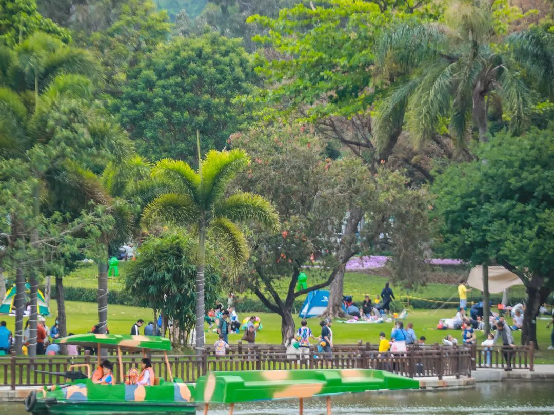 在公园里,人们不仅可以体验到皮划艇的乐趣,也可以乘坐小火车环绕赏景,找到远离城市生活的片刻宁静。