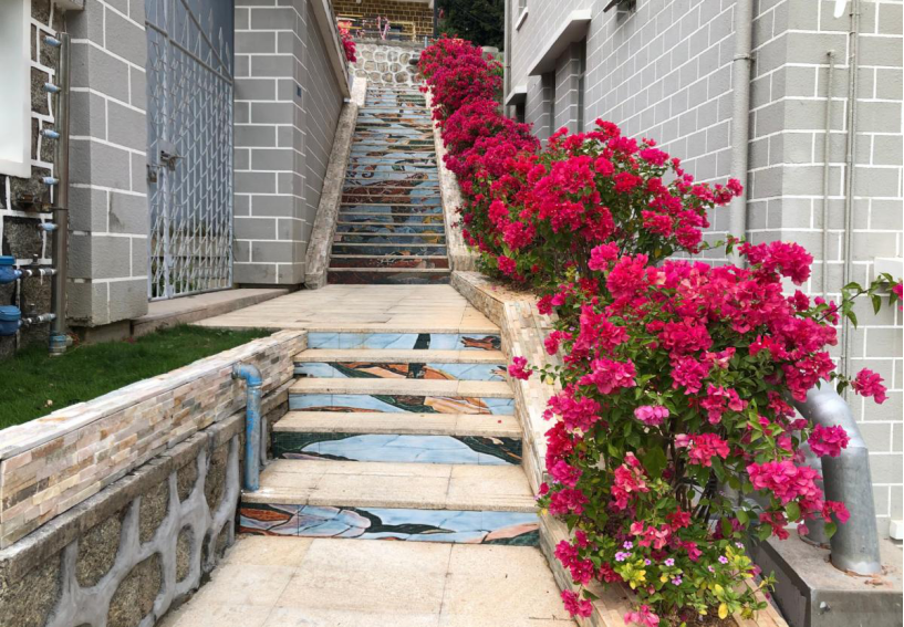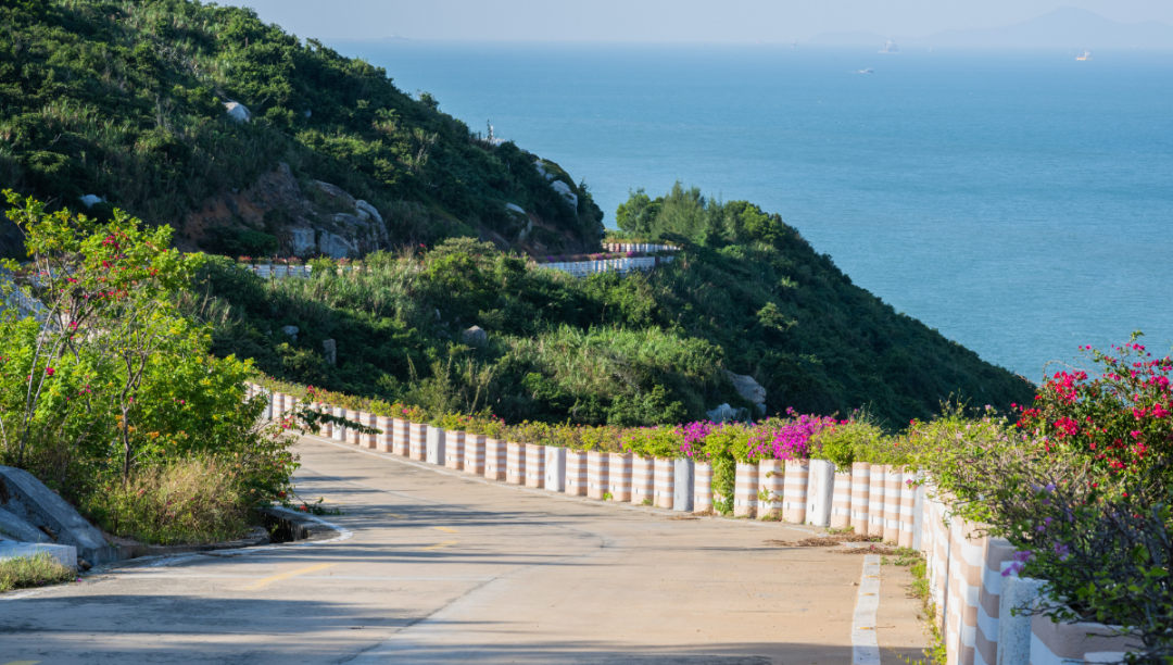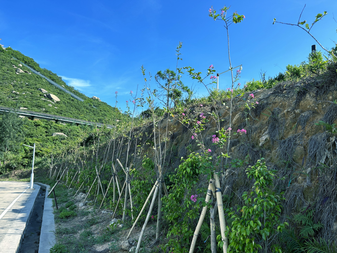 采用边坡绿化新技术,栽植爬山虎等藤本花草植物,实行海岛道路、山体边坡生态治理修复,实现高效复绿。