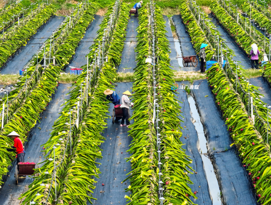 皮薄肉厚的火龙果,一口咬下去,玫红色的汁液顺着果实流淌。水肥一体化系统、真空预冷系统、质量安全追溯体系……口感极佳的火龙果背后,是各种现代化农业装备的加持。