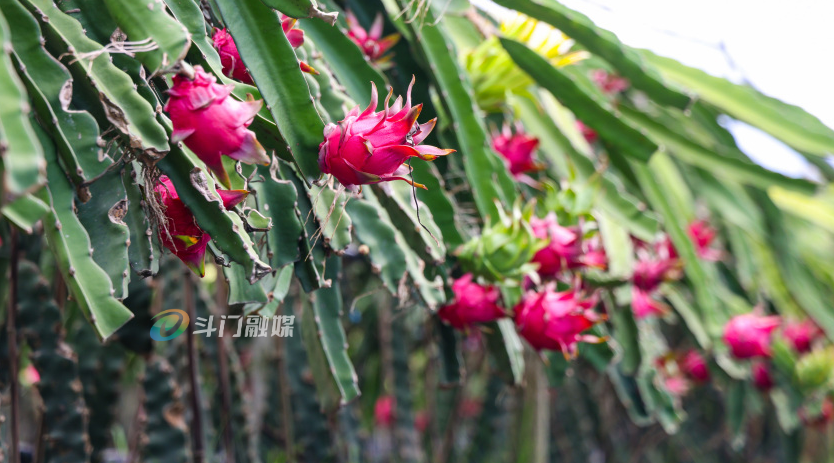 走进斗门镇荣东汇火龙果种植基地,红绿相间的色彩与沁人心脾的清香使人陶醉,犹如一团团“火焰”的火龙果挂满枝头,长势喜人。