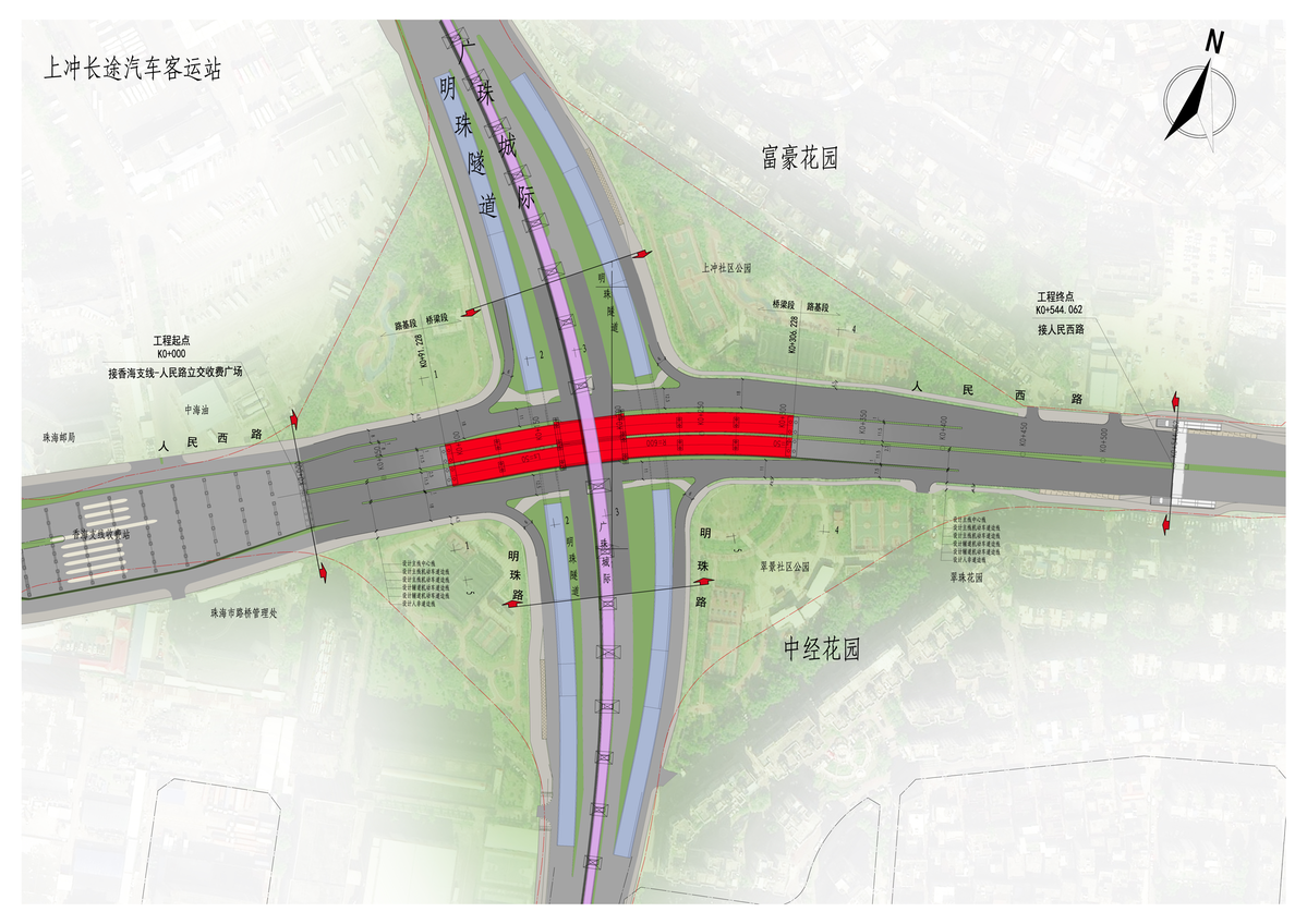 人民路起点位于香海支线人民路互通立交,终点位于凤凰路和海滨路交叉口。本项目是人民路快速化改造的节点工程,位于人民西路与明珠路交叉口,西起于香海支线人民路立交收费广场,向东以桥梁形式下穿广珠城际铁路,于上冲公交站西侧接地。桥面设计标高距离铁路桥梁底面最小高度约为4.6米,其中桥梁段总长215米,挡墙路基段约205米,全长约425米,为城市主干路的双向6车道,设计车速主线跨线桥为60千米/小时,地面辅道为40千米/小时。