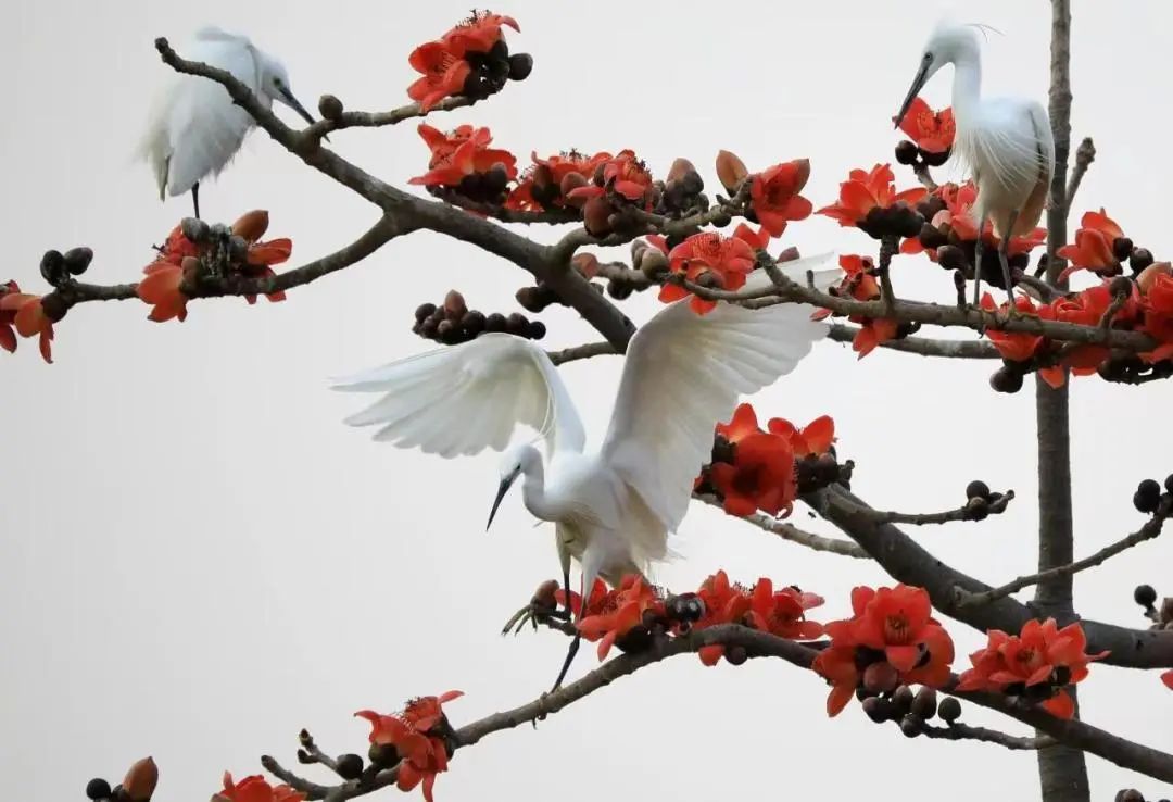 在三板村鹭鸟天下,几只白鹭正在枝头打闹、嬉戏。