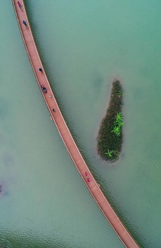 大门口湿地公园栈道在水面上穿行而过。