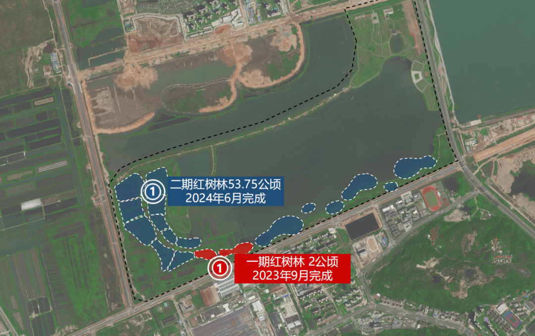 红树林种植,位于湖滨路和双湖路交叉口东北侧,总营造面积2公顷,目前正在进行种植岛地形挖填,预计8月底完成种植岛地形塑造,9月底完成红树种植。